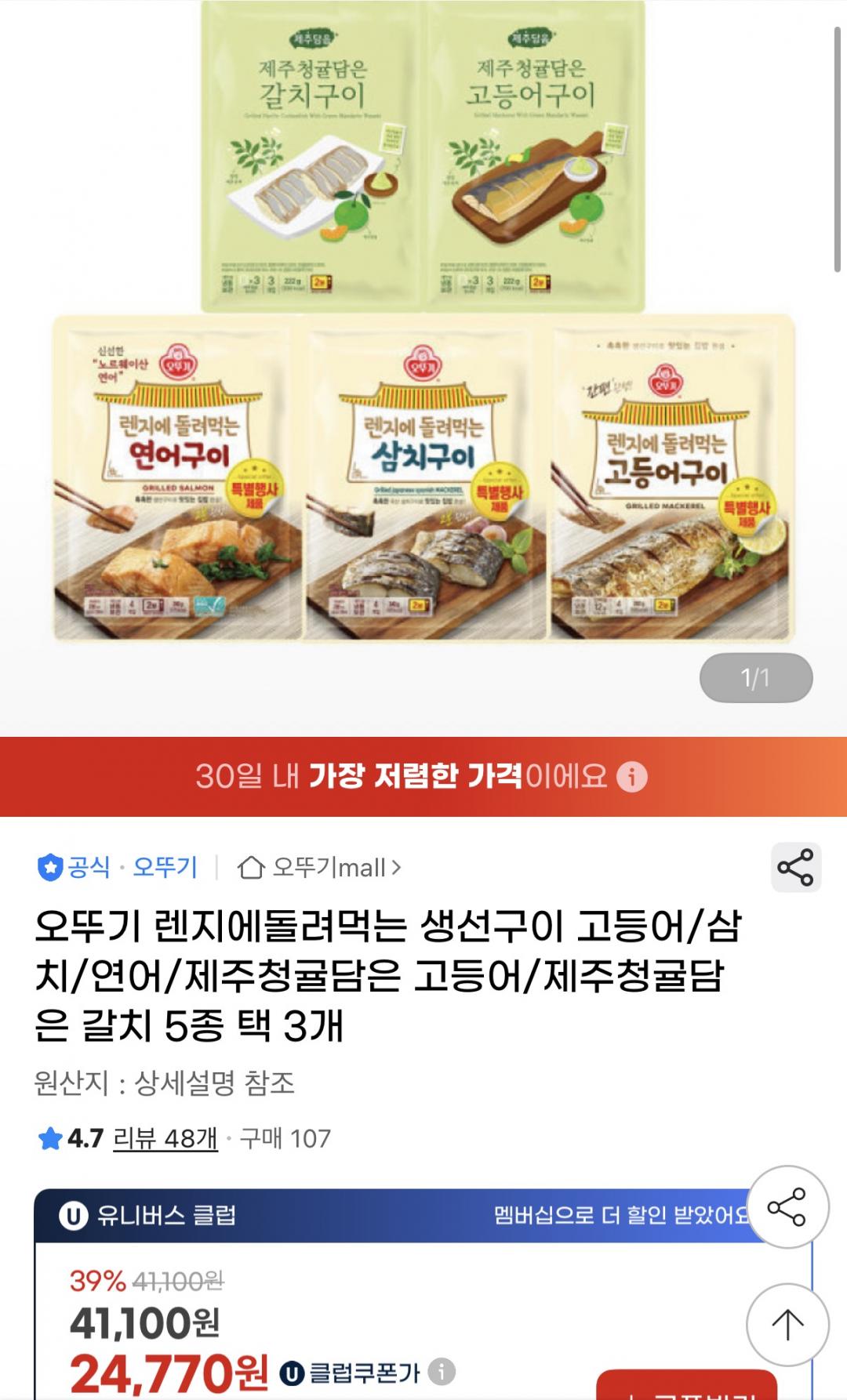 [지마켓] 오뚜기 렌지 돌려먹는 생선구이 5종 택3 (유클24,770원/무료) > 국내핫딜