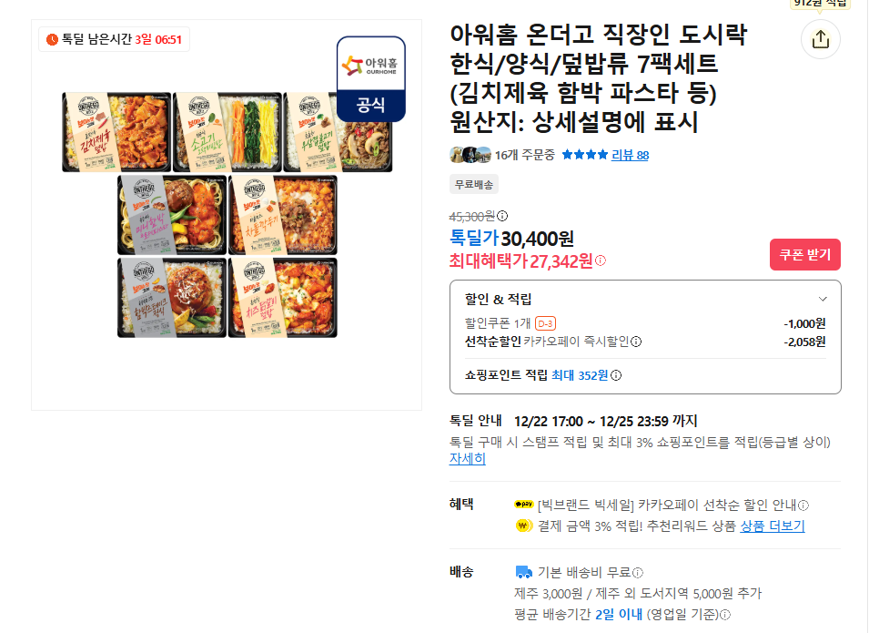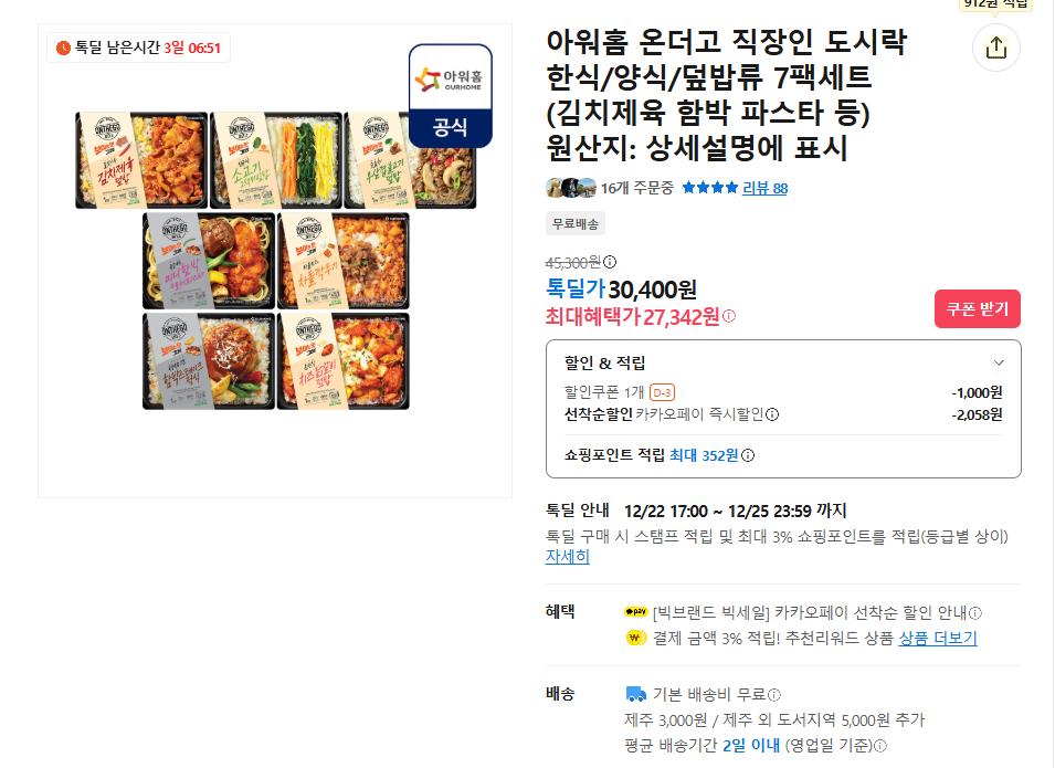 카카오) 아워홈 온더고 도시락 7팩 세트 할인가 27,340원 > 국내핫딜