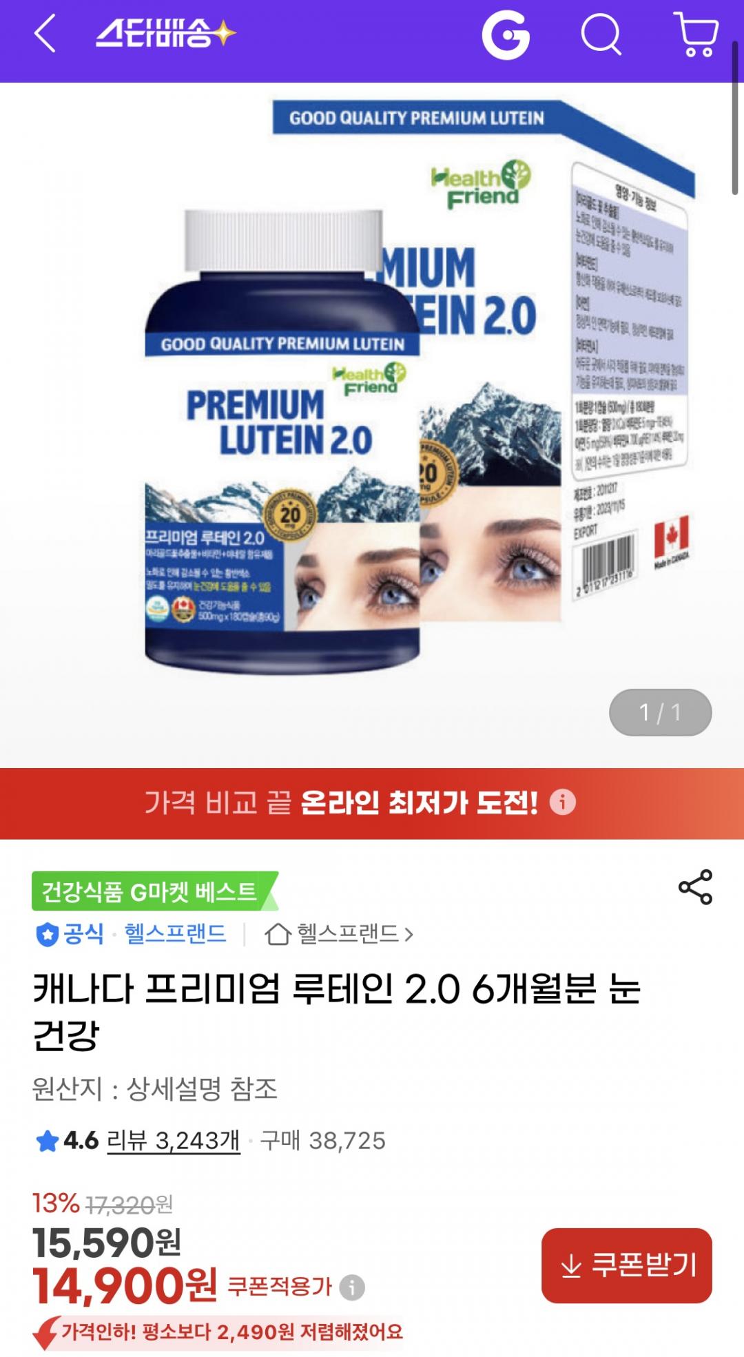 [지마켓] 캐나다 직수입 프리미엄 루테인 6개월분 대용량 (14,900원/무료) > 국내핫딜