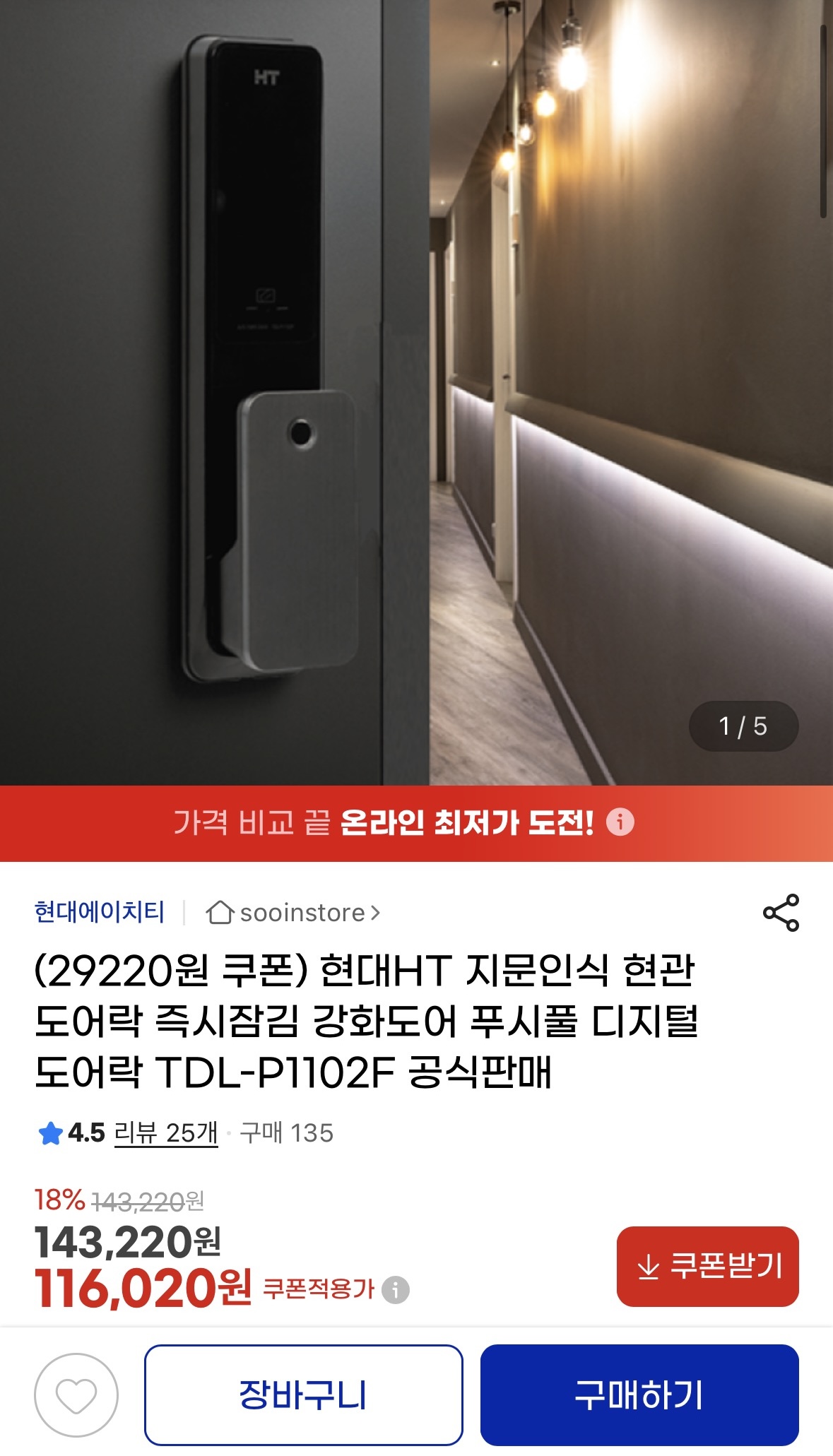 [지마켓] 푸시풀 현관 지문인식 디지털도어락 (116,020원/무배) > 국내핫딜