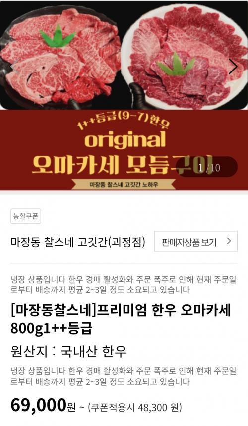 마장동 한우1++ 꽃등심 채끝살 갈비살 등 부위는 4가지 랜덤이에요 오늘 자정까지 농할쿠폰30% 쓰면 48,300원 나오네요 상생페이백도 사용할수있어요