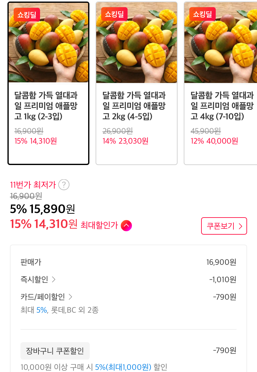 [11번가] 애플망고 1kg (2-3입) (14,310원/무료)