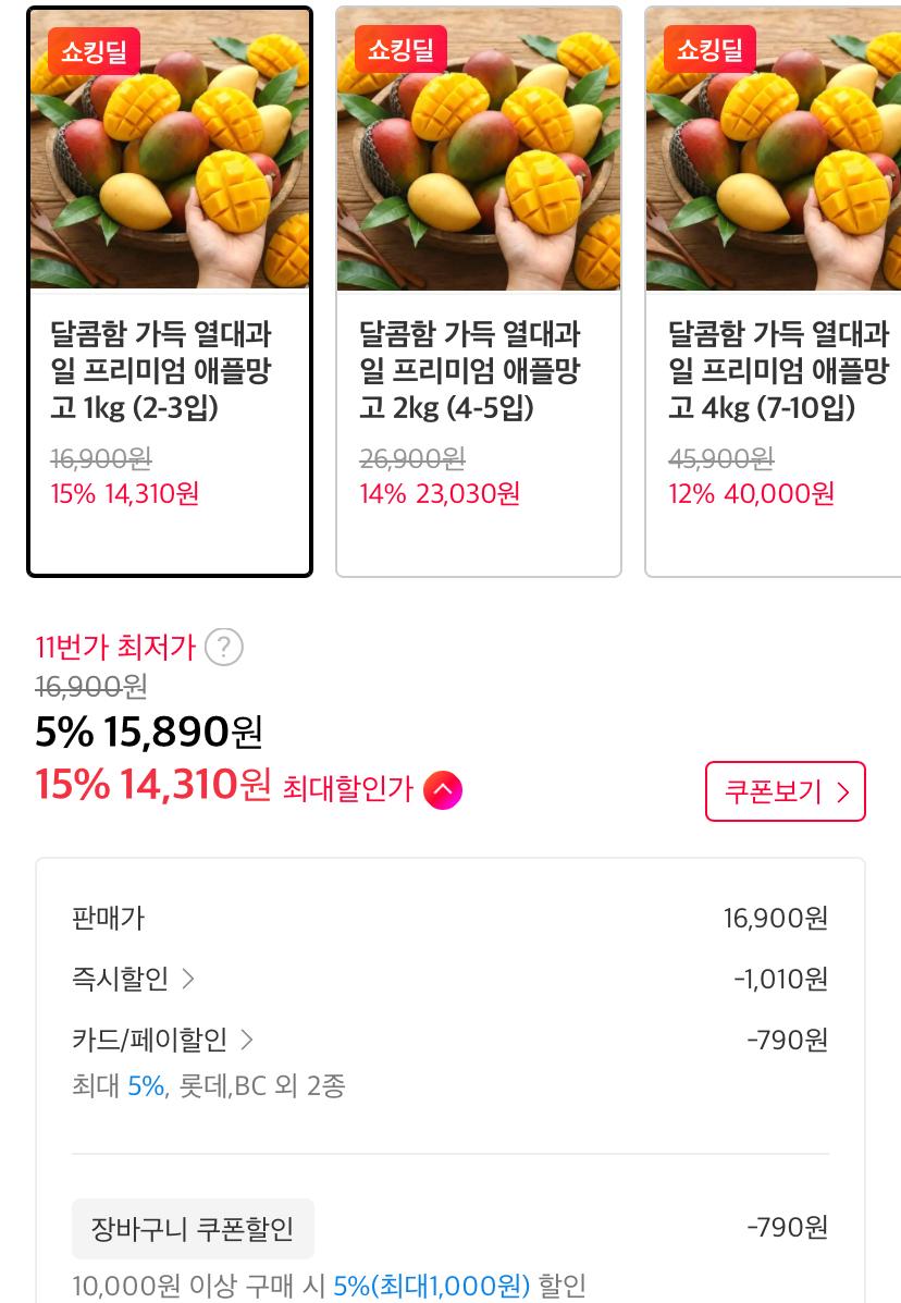 [11번가] 애플망고 1kg (2-3입) (14,310원/무료) > 국내핫딜