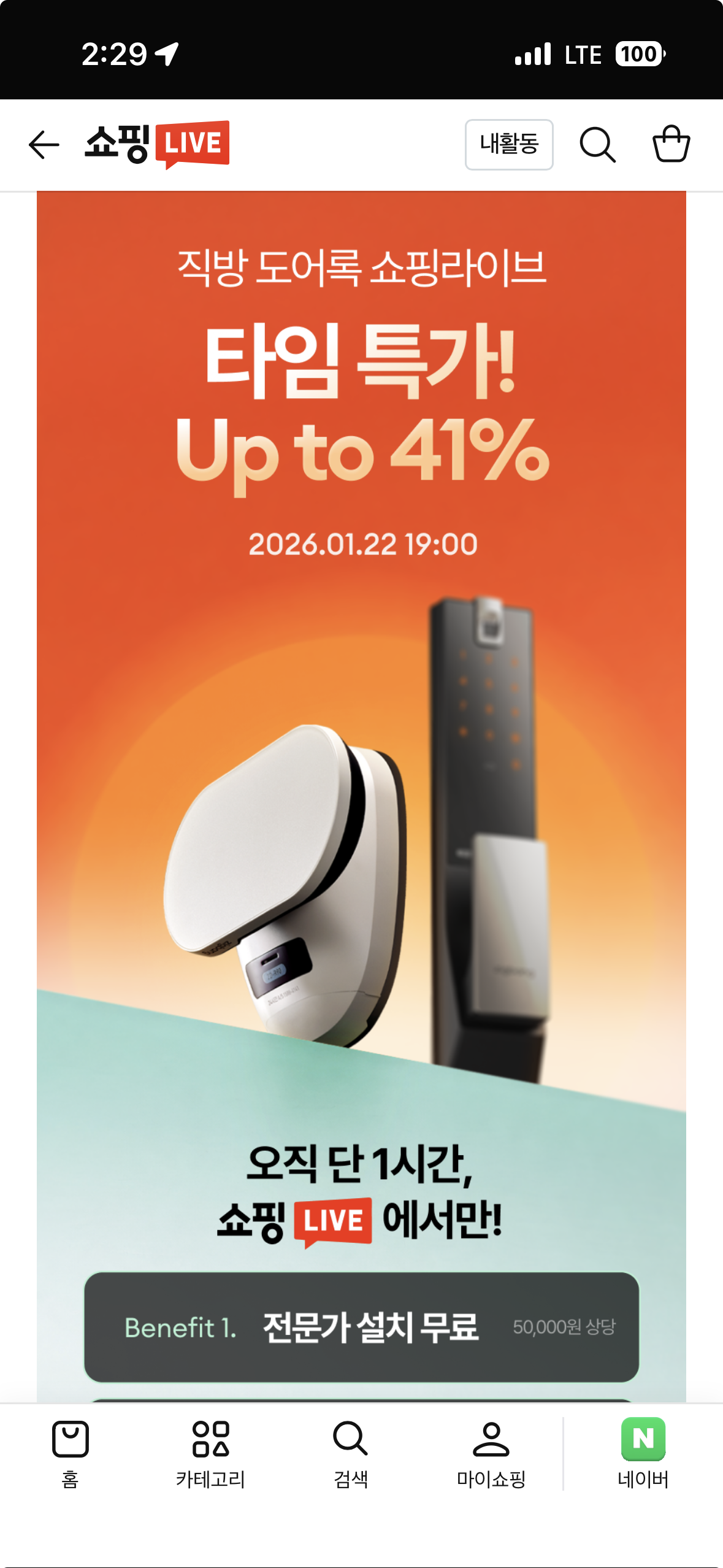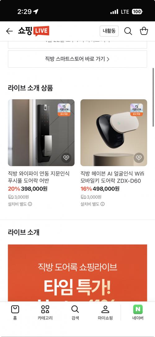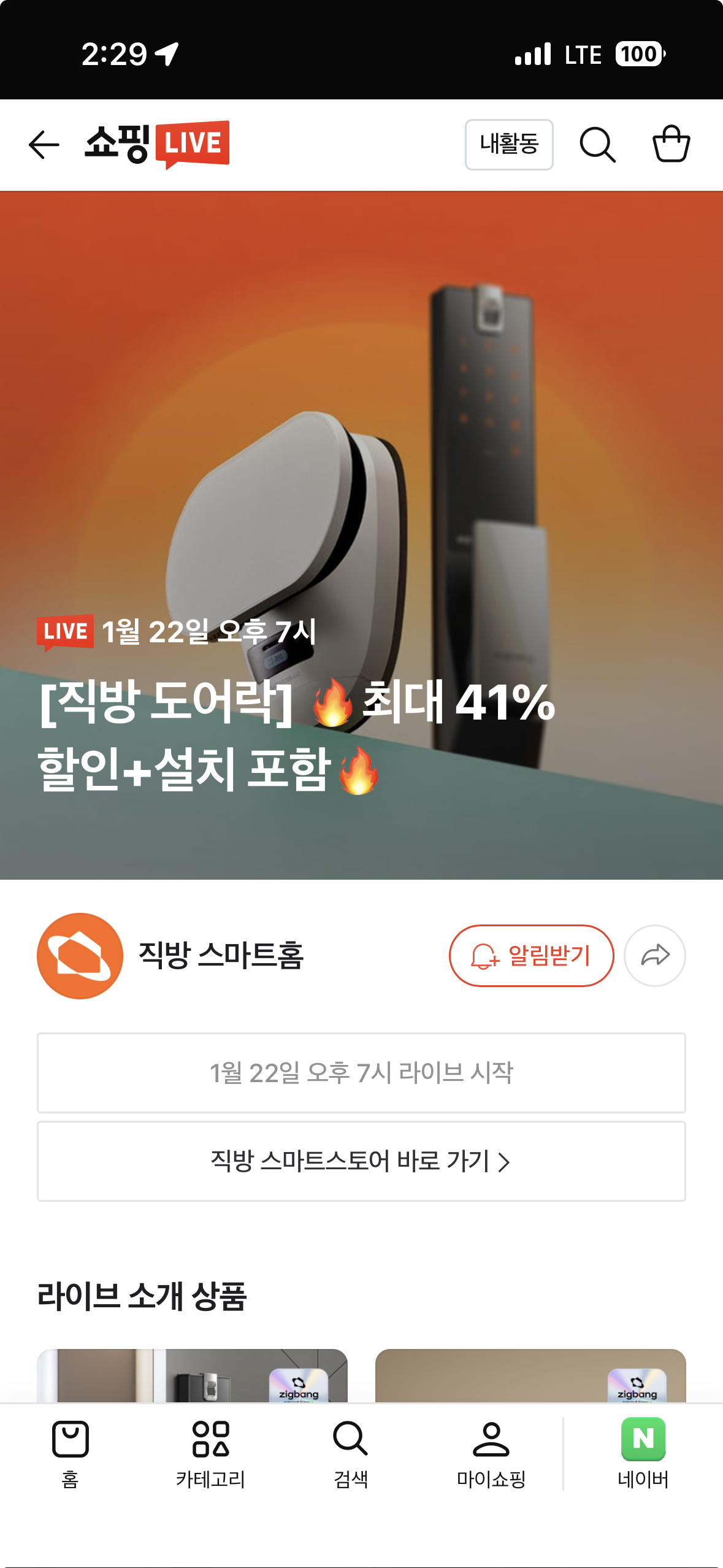 22일 19시에 네쇼라에서 직방 도어락 2종 라이브 할인 예정입니다