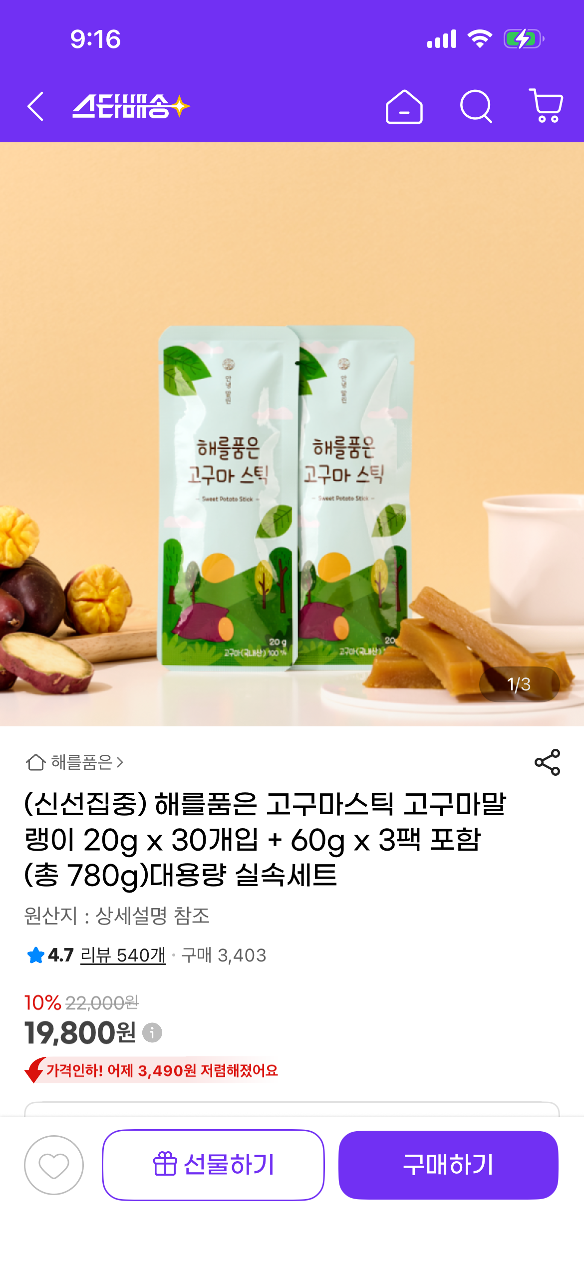 [지마켓] 고구마스틱 고구마말랭이 20g x 30개입 + 60g x 3팩 포함 (19,800원/무료) > 국내핫딜