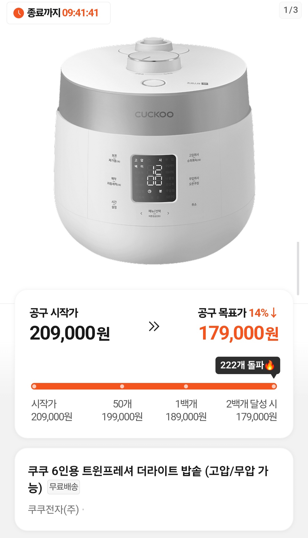 [카카오] 쿠쿠 6인용 트윈프레셔 밥솥 공구 (209,000원/무료)