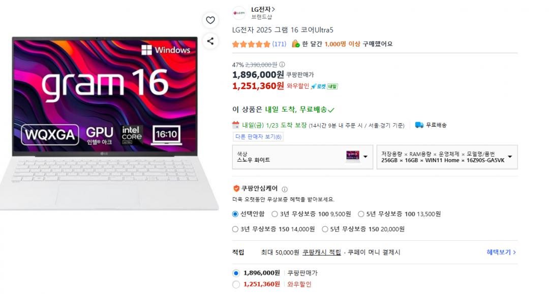 [쿠팡] 엘지 그램 16Z90S-GA5VK (1,251,360원/무료)
