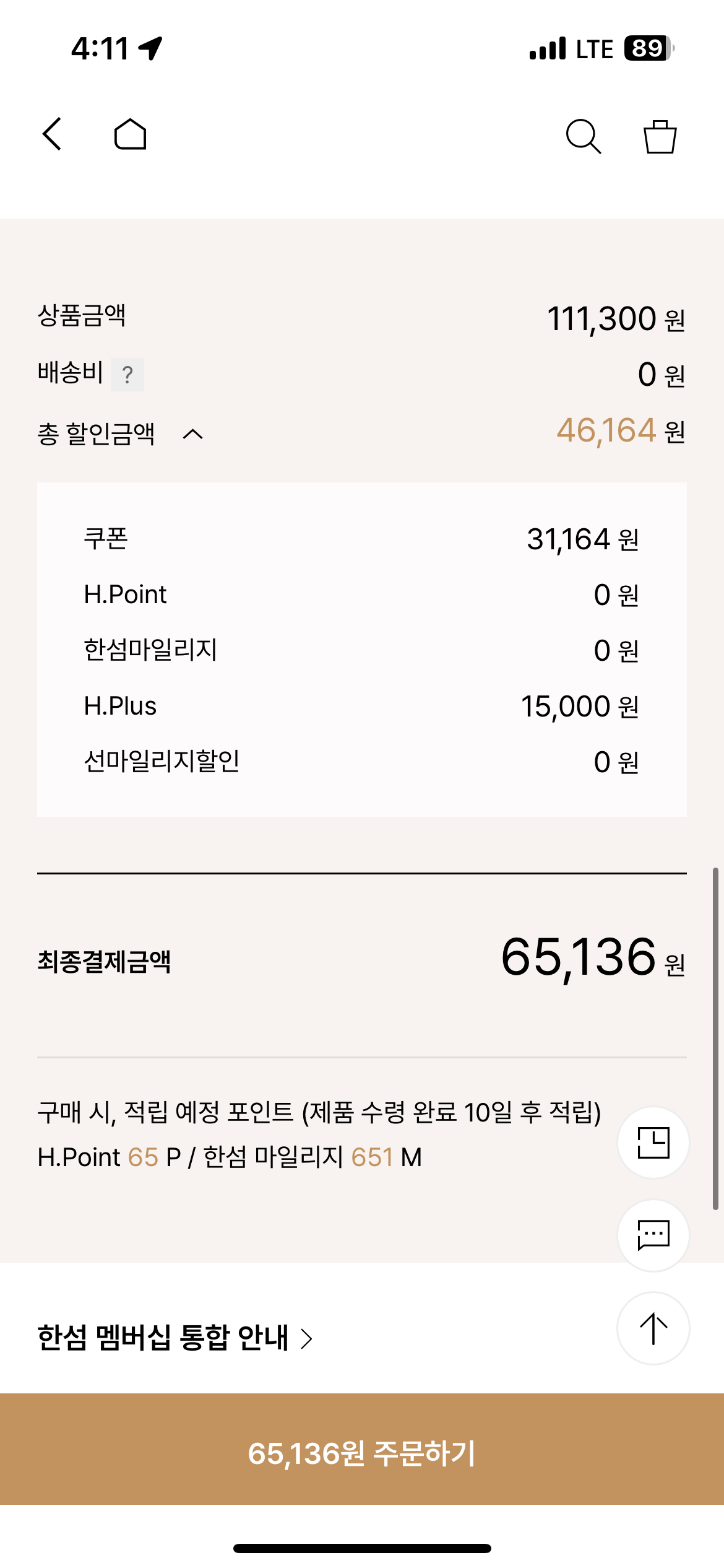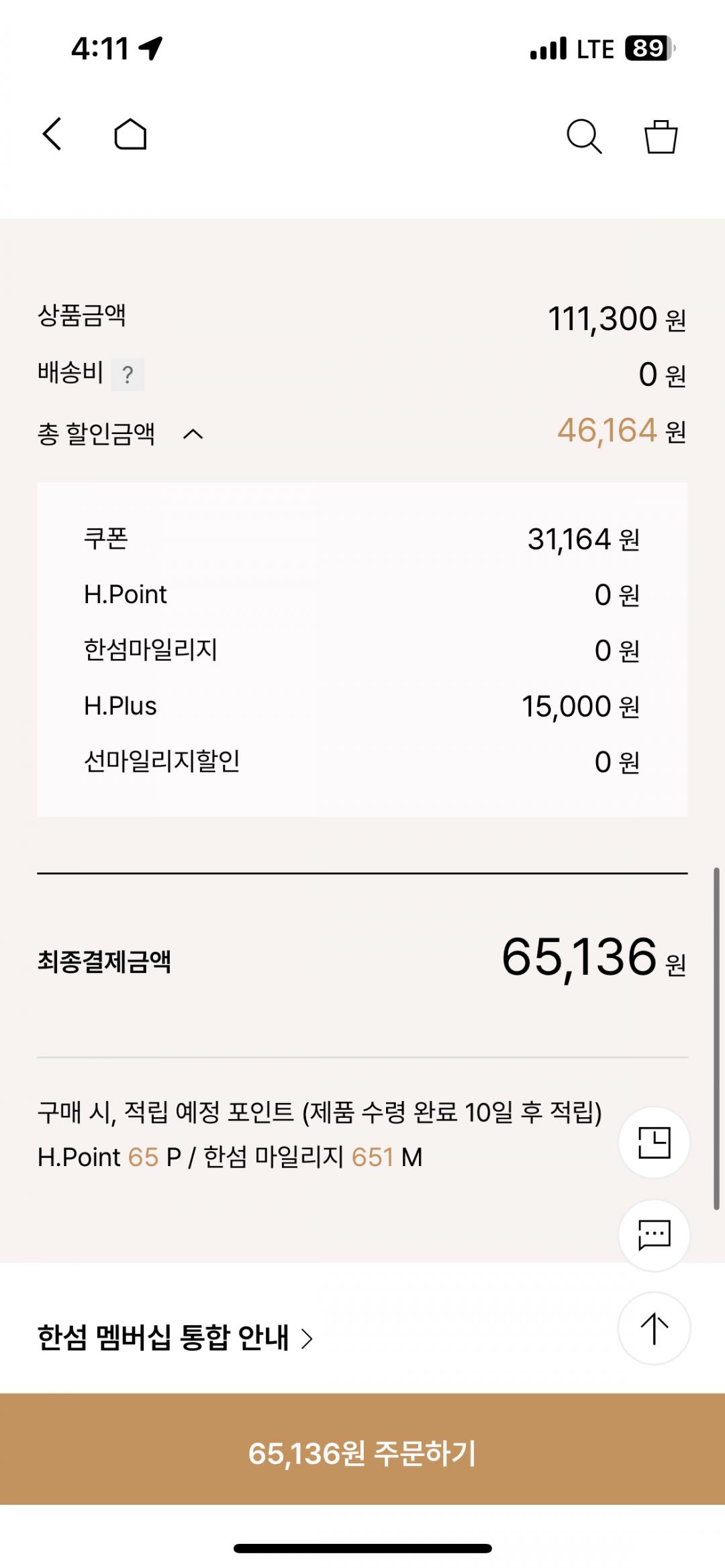 타미쿠폰, 슈퍼세이브쿠폰, 포인트 모두 결합하면 최종가 65,136원 나옵니다