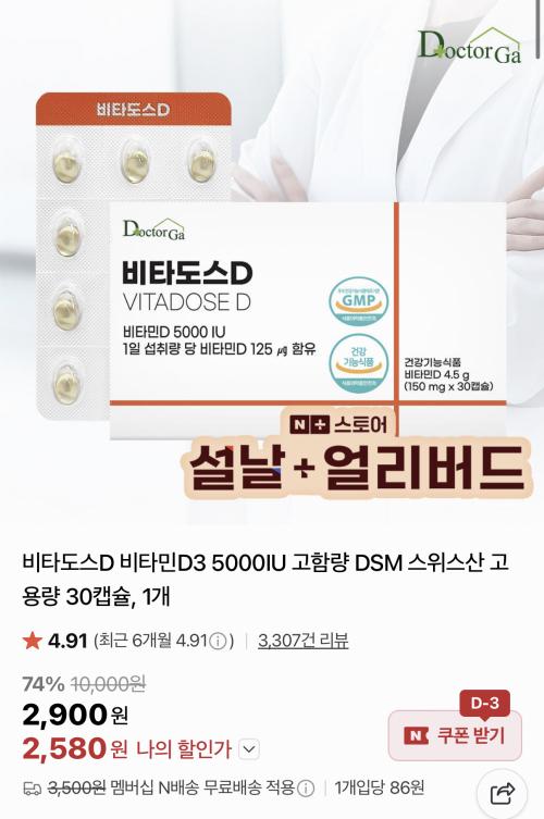 [네이버] 비타도스D 비타민D3 5000IU 30캡슐 (2,580원/무료)