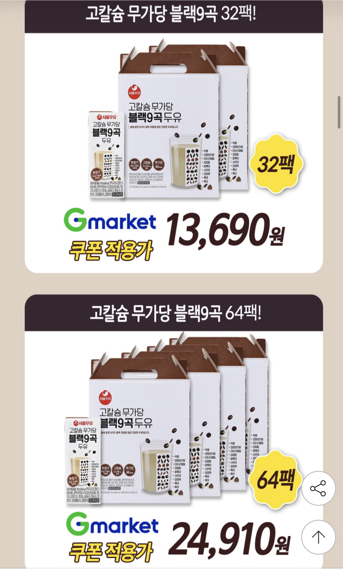 [지마켓] 서울우유 고칼슘 무가당 블랙9곡 두유 190ml 32팩 (13,690원/무료) > 국내핫딜