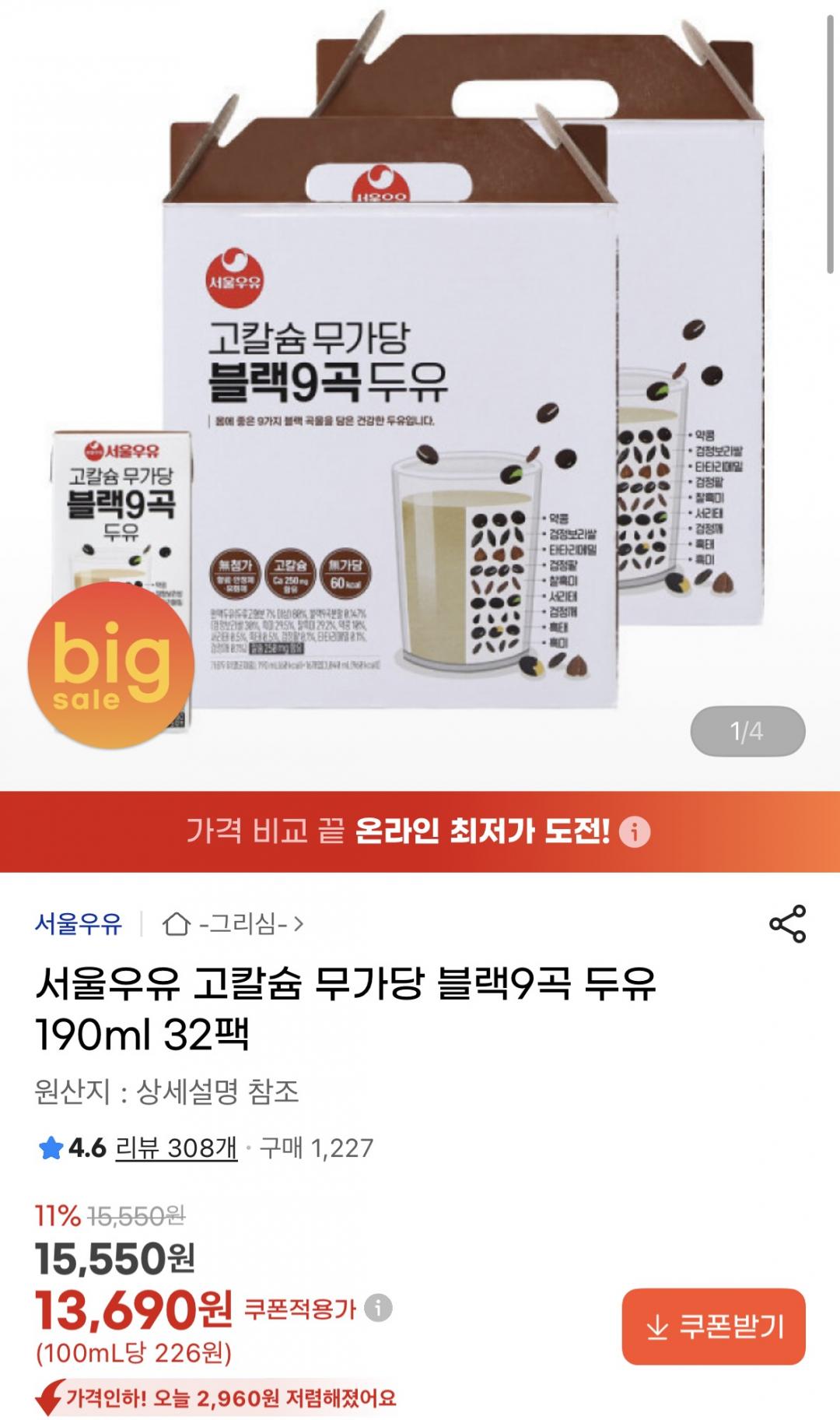 [지마켓] 서울우유 고칼슘 무가당 블랙9곡 두유 190ml 32팩 (13,690원/무료)