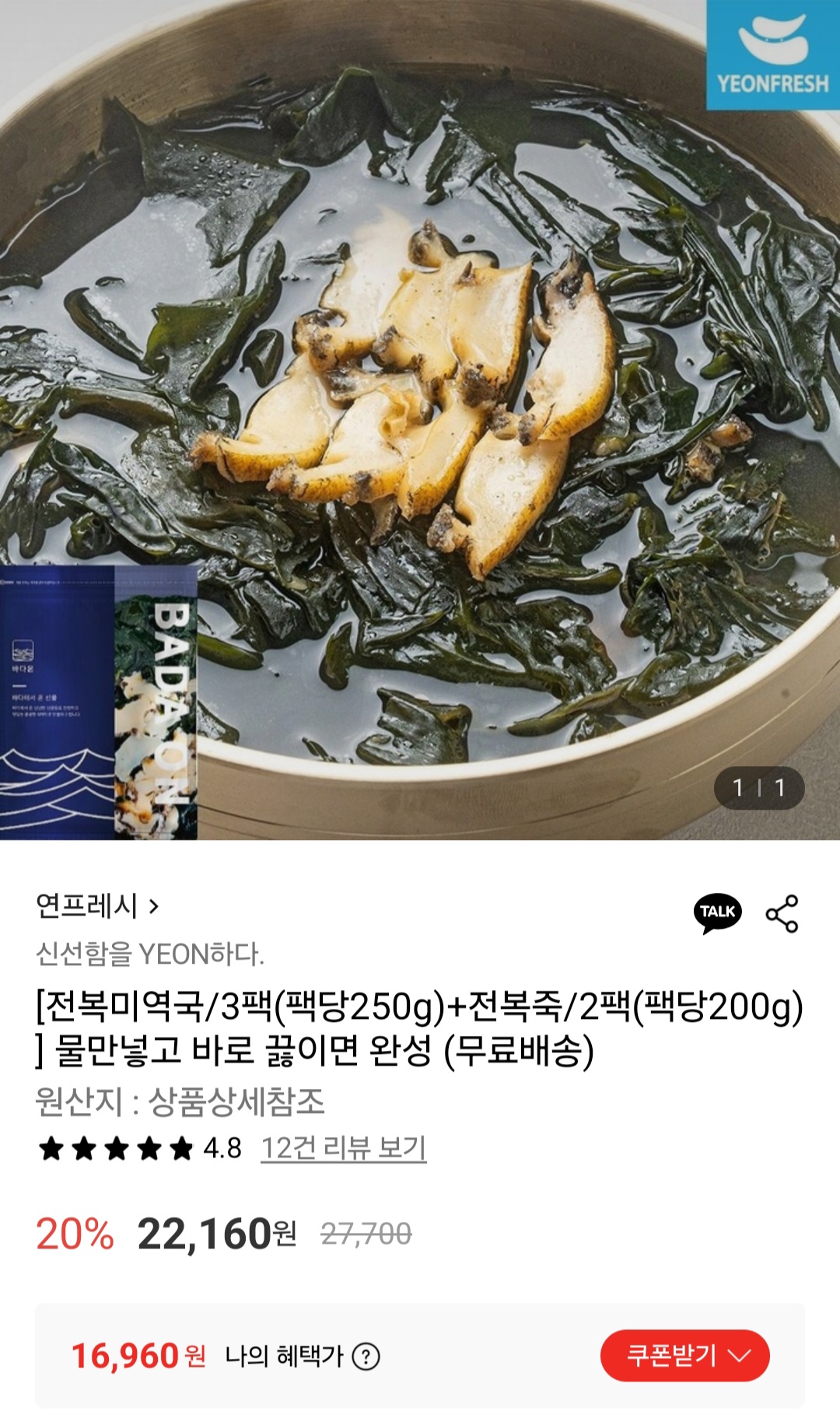 [롯데온] 전복미역국 3팩 + 전복죽 2팩 (16,960원/무배) > 국내핫딜