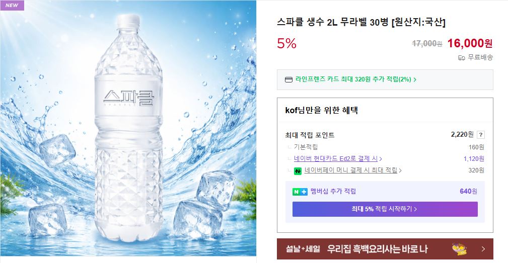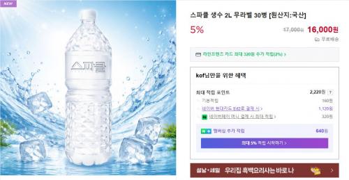 [네이버] 스파클 생수 2L 30개 싼곳 발견함 (16000/무배)