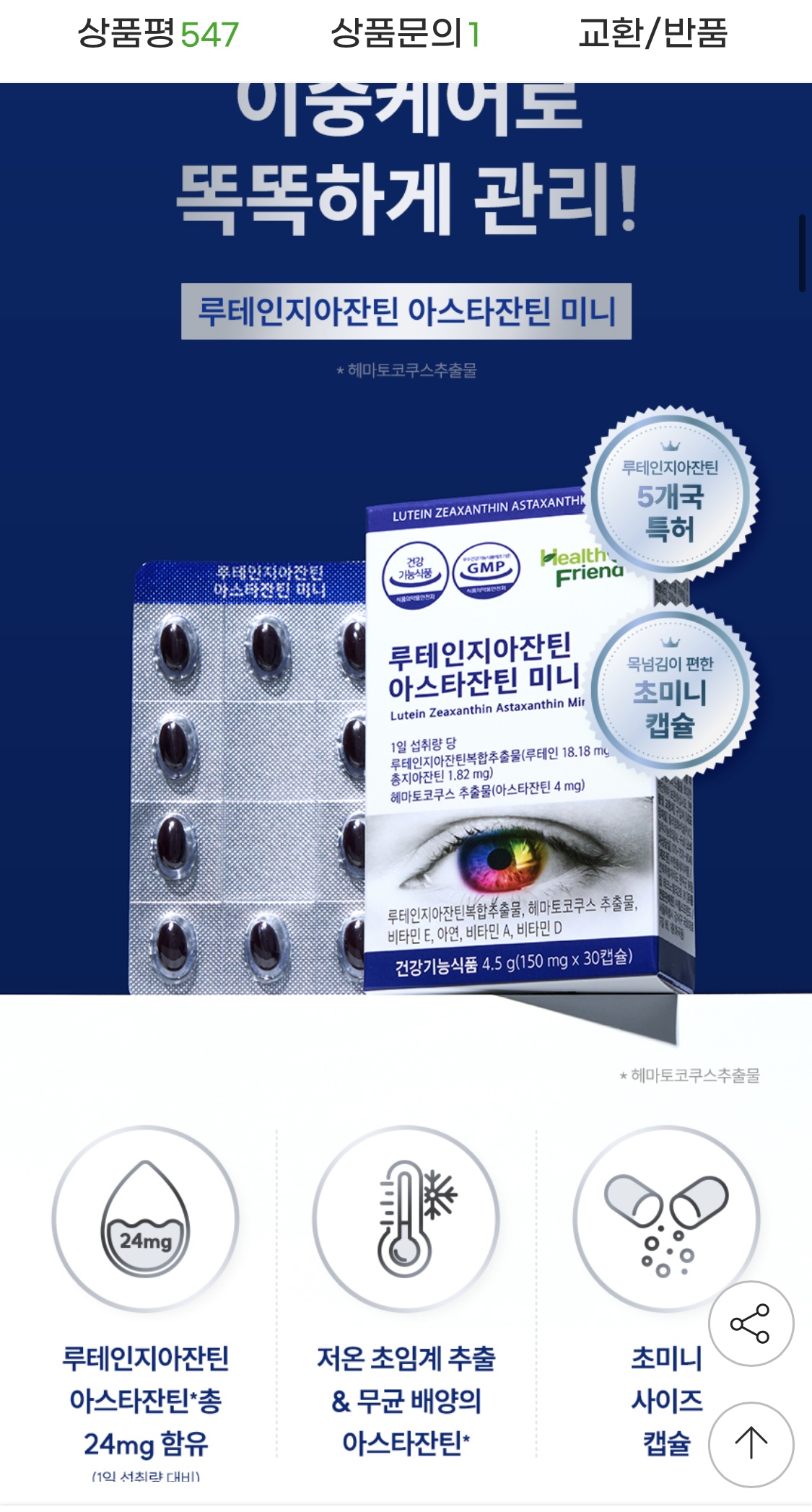 한캡슐당 루테인 18.18mg + 지아잔틴 1.82mg + 아스타잔틴 4mg 든거라 1일 섭취량 충족 함량 좋습니다