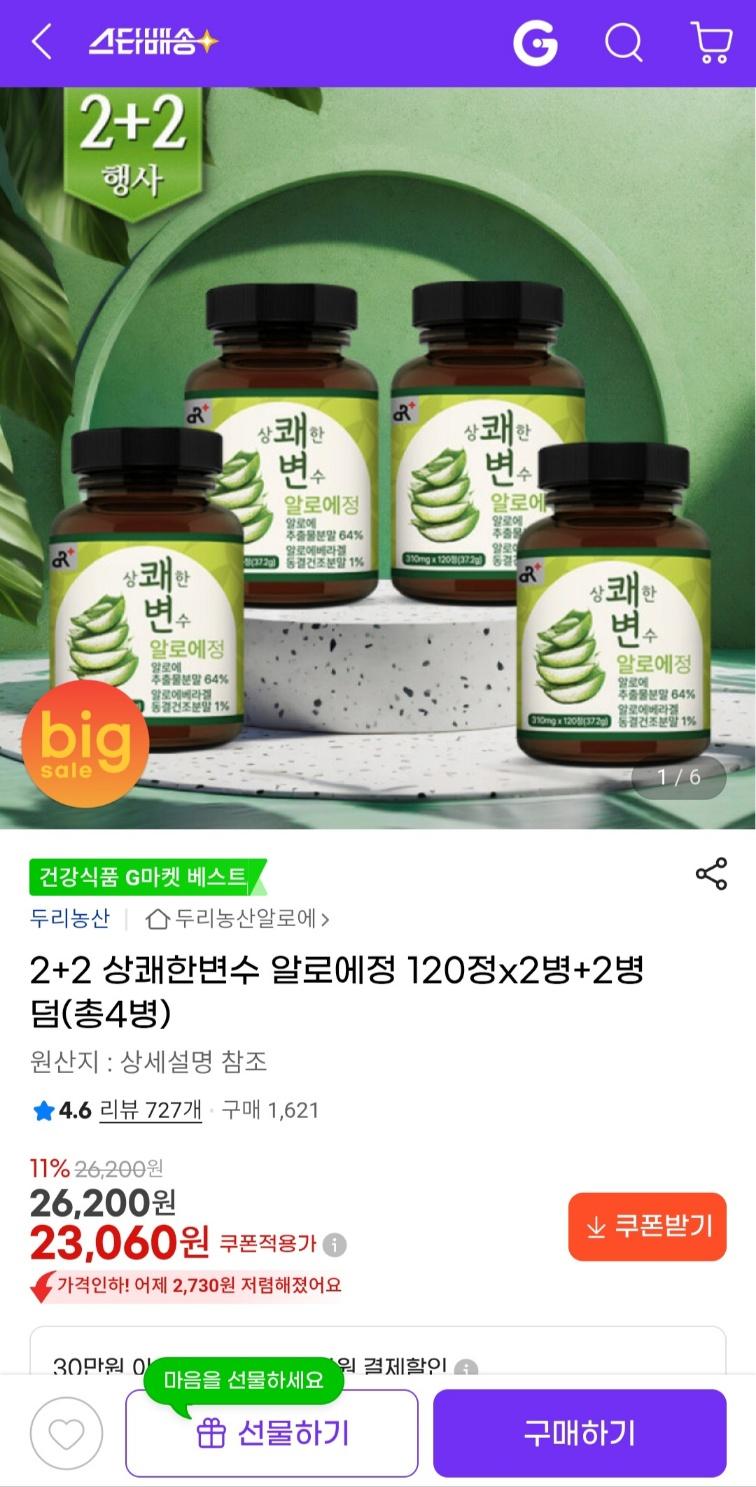 [지마켓] 상쾌한변수 알로에정 120정 2+2 (23,060원 / 무료배송)