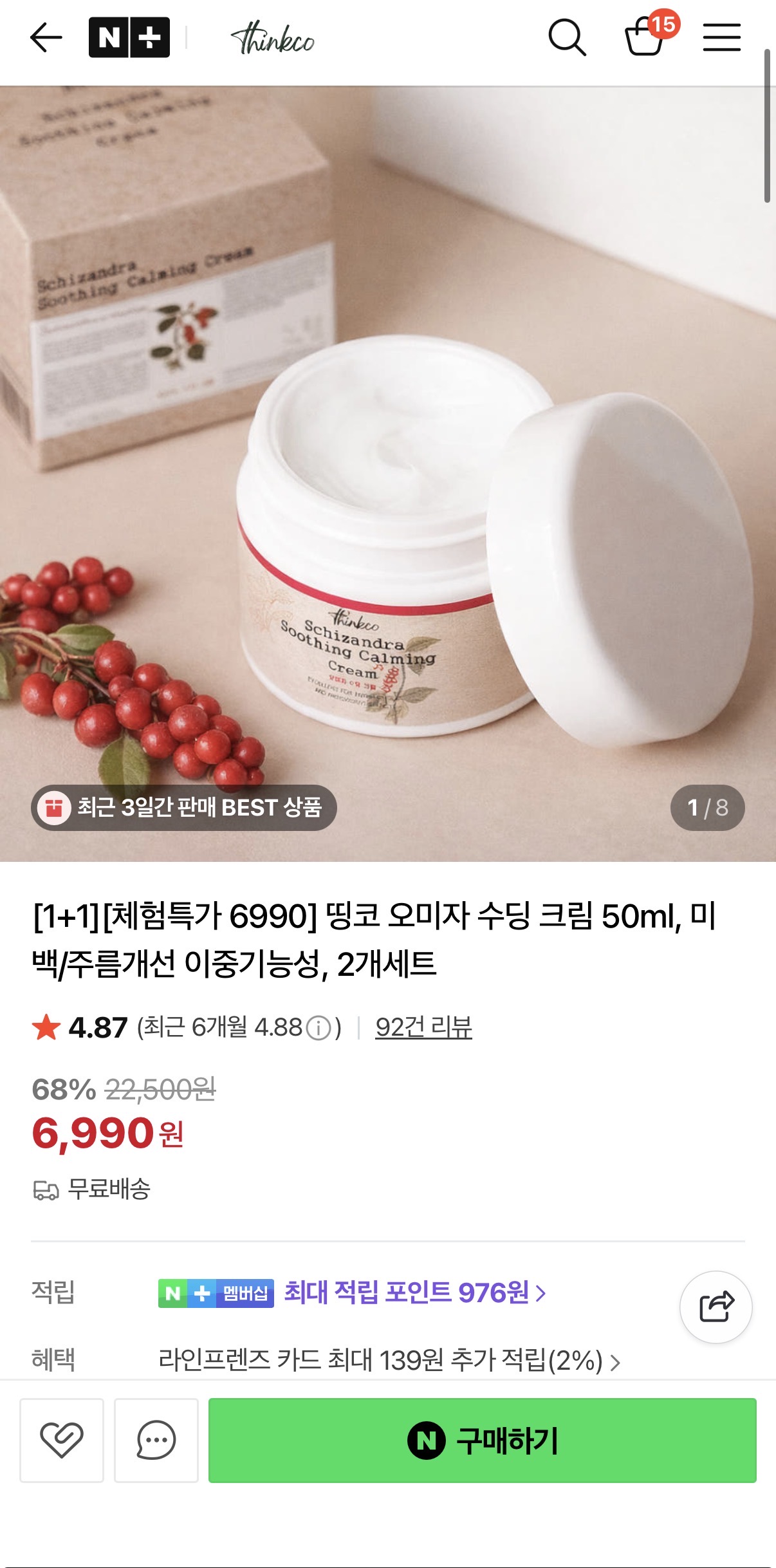[네이버] 띵코 오미자 수딩크림 50ml 1+1 체험특가 6,990원 / 무배 > 국내핫딜
