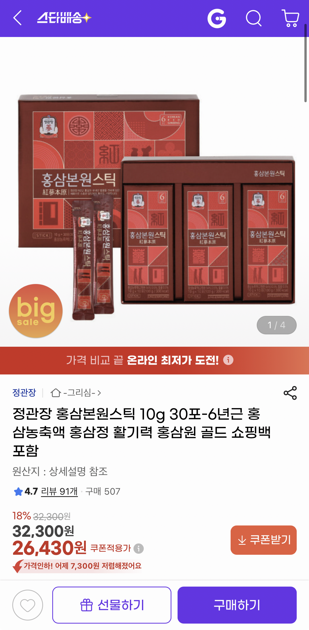 [지마켓] 정관장 홍삼본원스틱 10g x 30포 (26,430원/무료)