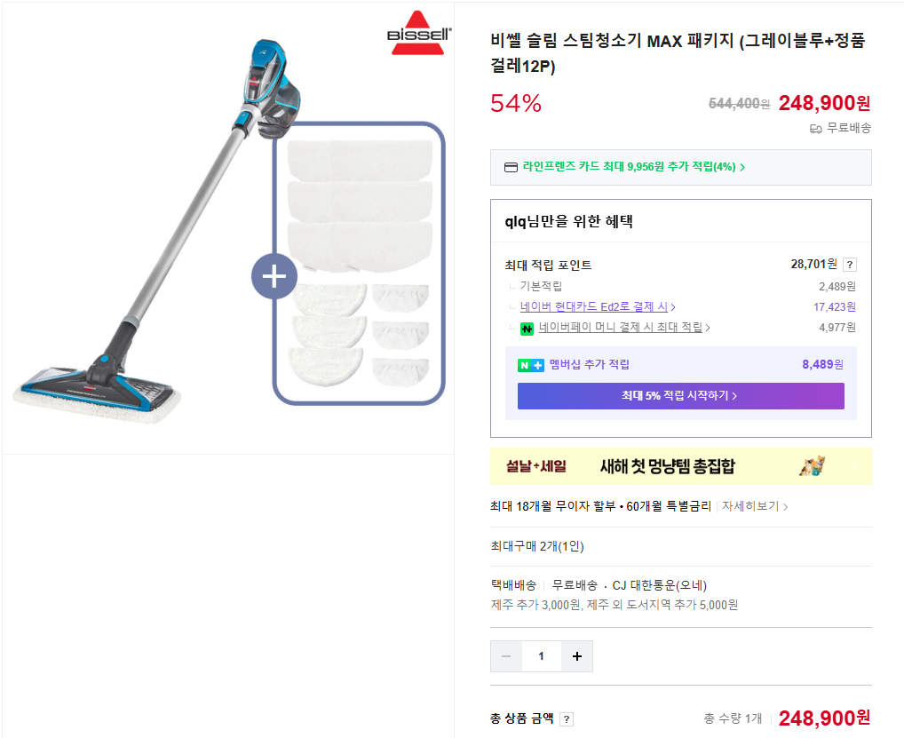 [네이버] 비쎌 슬림 스팀청소기 MAX 패키지 (248,900원 / 무배)