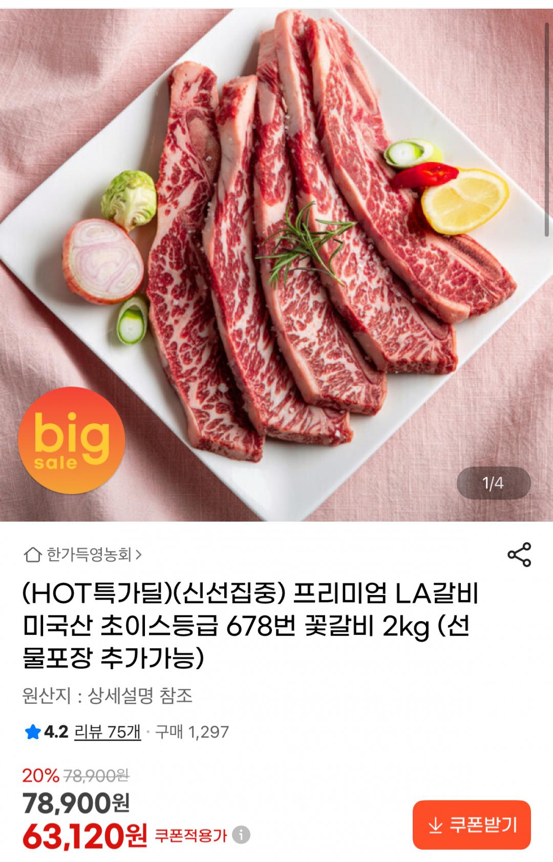 [지마켓] 프리미엄 LA갈비 초이스등급 678번 꽃갈비 2kg (63,120원/무배) > 국내핫딜