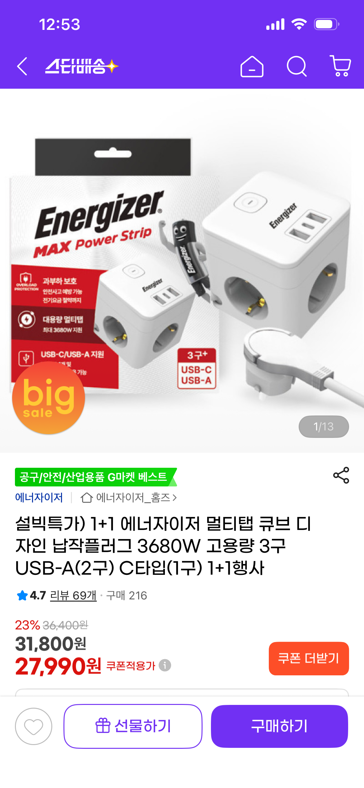 [지마켓]) 1+1 에너자이저 큐브 3구 멀티탭 3 (27,990원/무료)