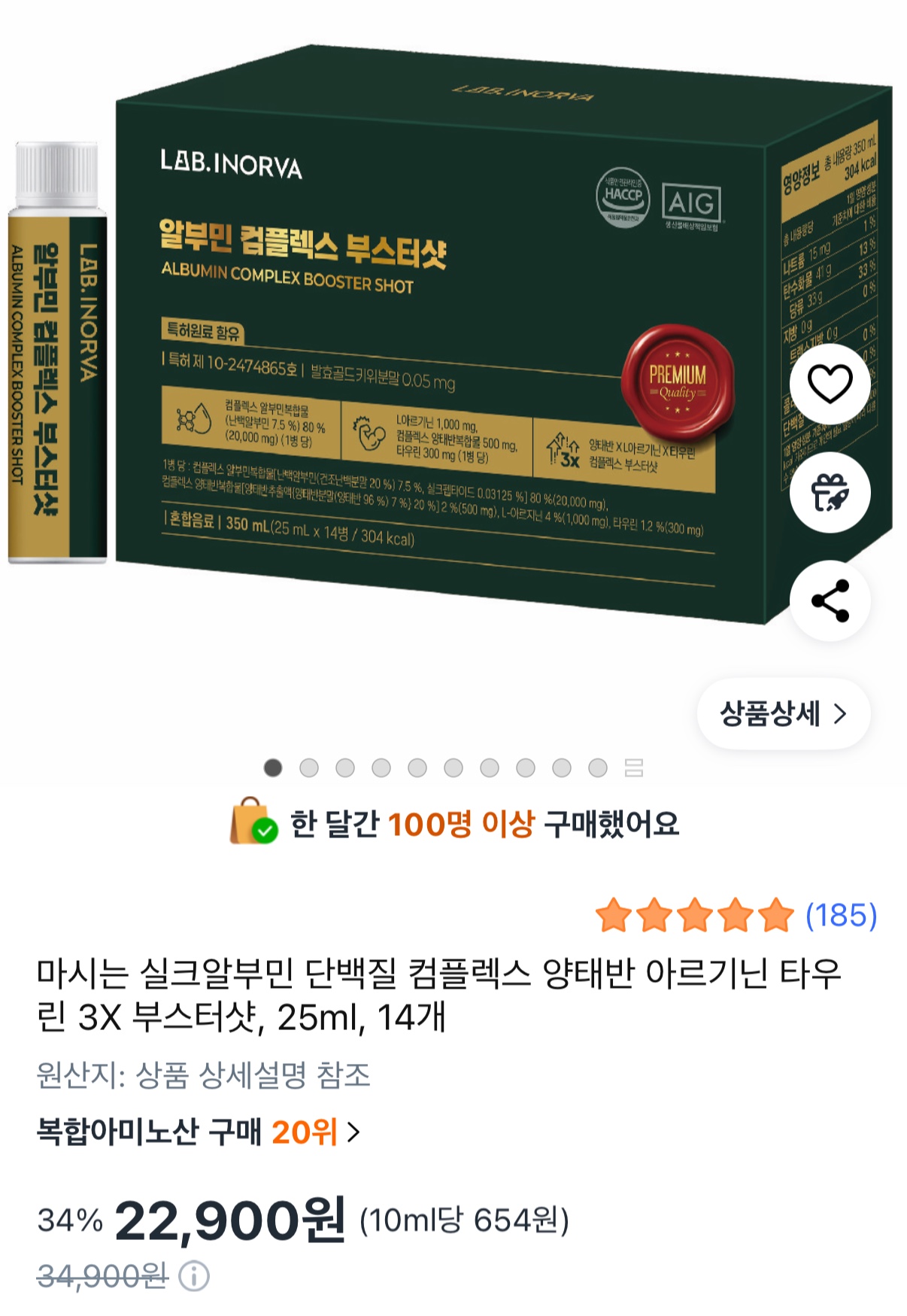 [쿠팡] 마시는 실크 알부민 타우린 3x 부스터샷 25ml 14병 (22,900원/무료)