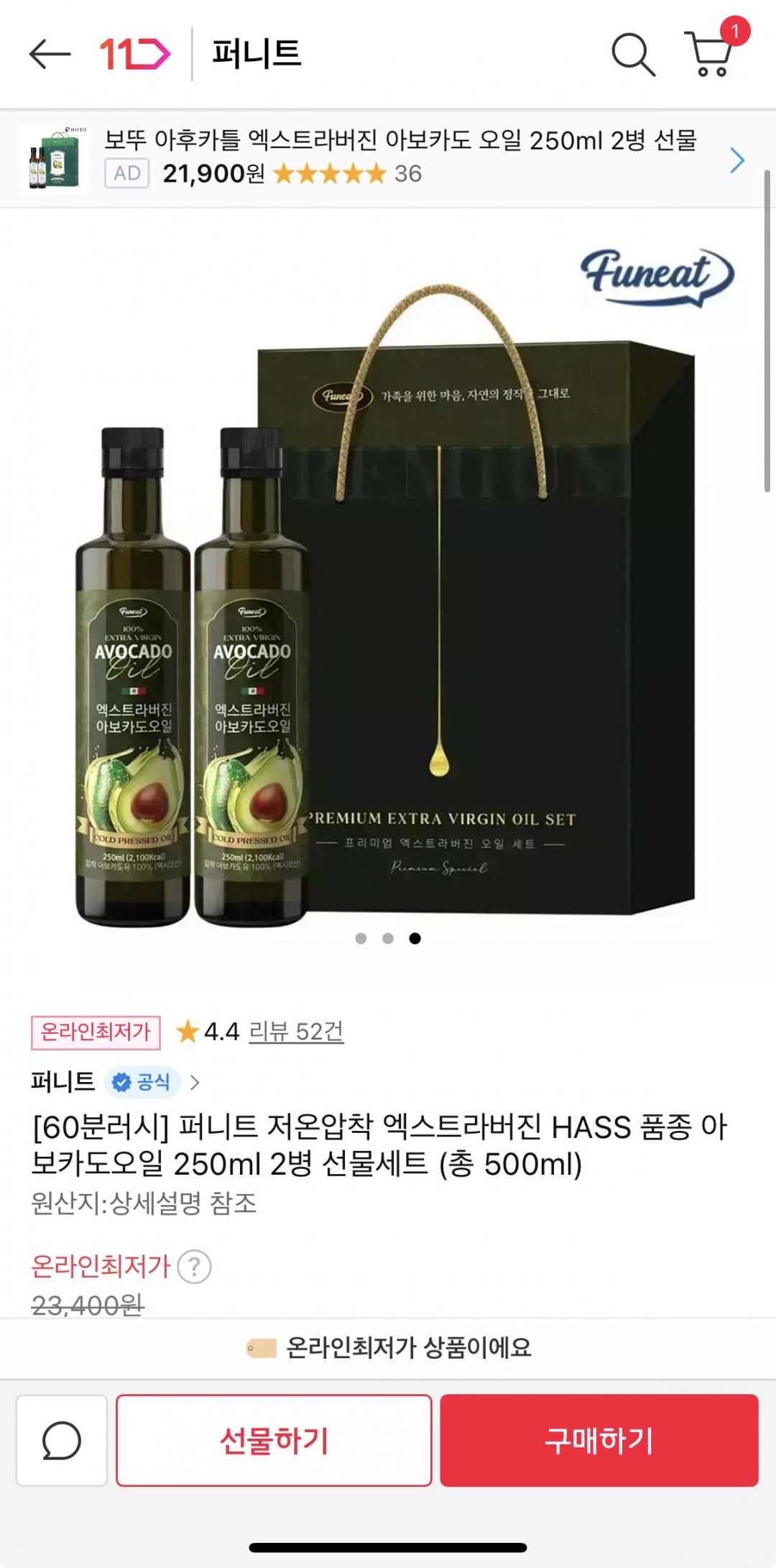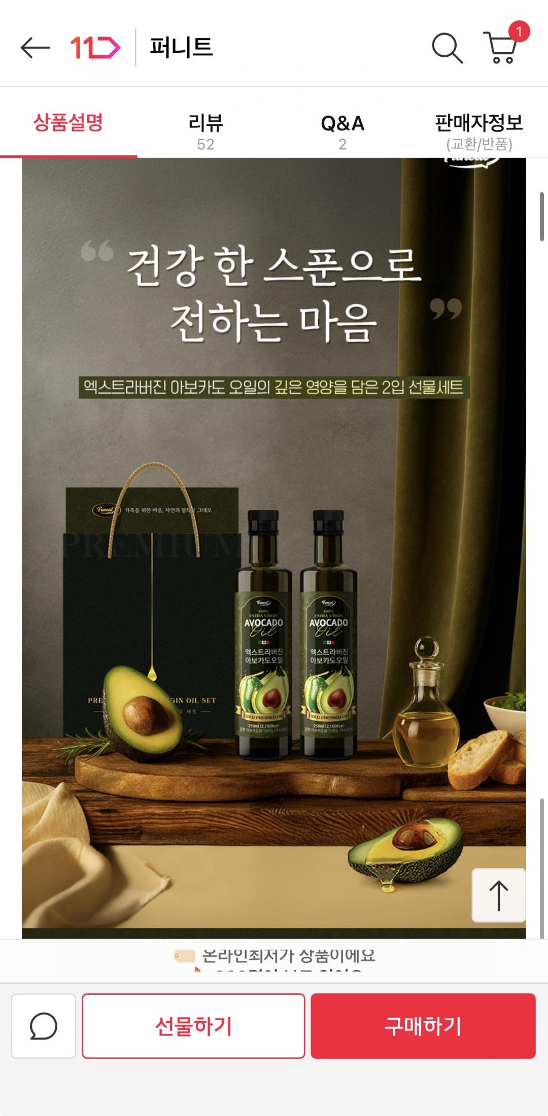 [11번가] 퍼니트 저온압착 엑스트라버진 HASS 품종 아보카도오일 250ml 2병 선물세트 (19890원/무배) > 국내핫딜
