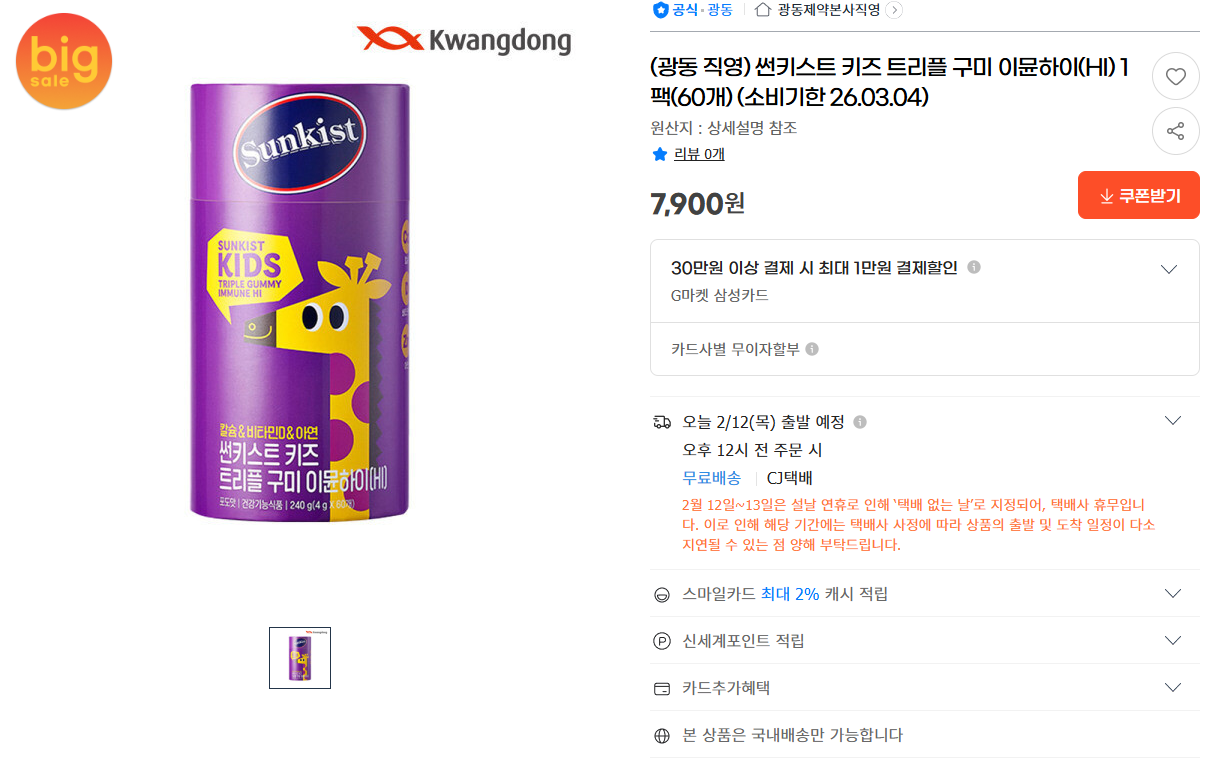 [G마켓] 광동 썬키스트 키즈 트리플 구미 이뮨하이 1팩(60개) (7,900원 / 무료)
