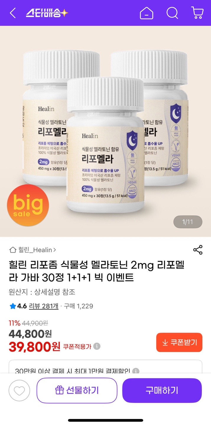 [지마켓] 힐린 비건 리포좀 식물성 멜라토닌 2mg 30정 1+1+1 (39,800원/무배) > 국내핫딜