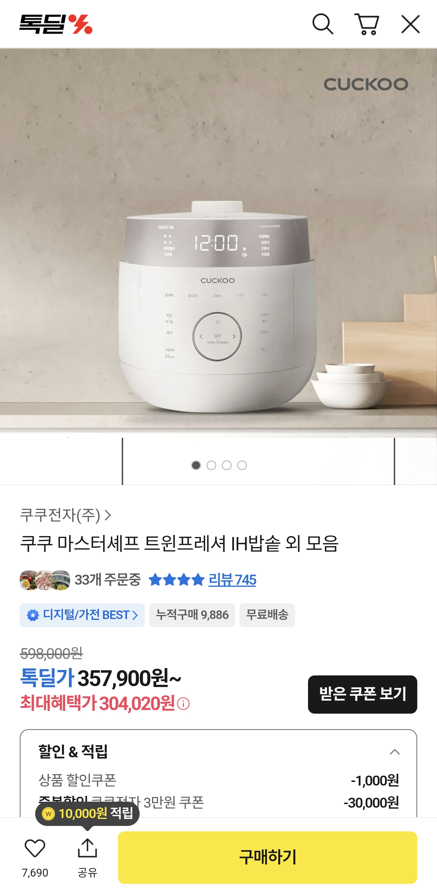 [톡딜] 쿠쿠 트윈프레셔 마스터셰프 6인용 밥솥 (304,017원/무배) > 국내핫딜