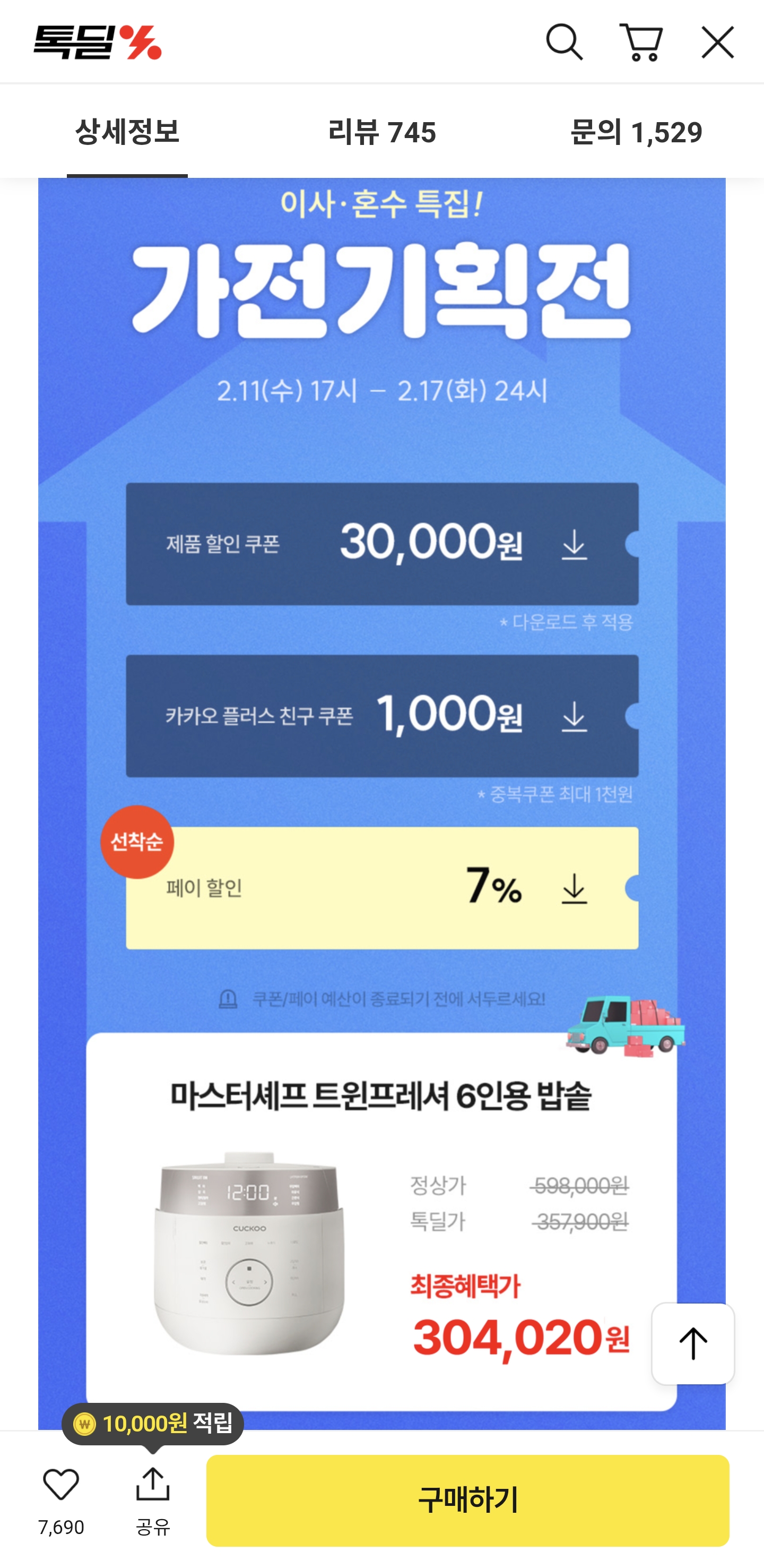 [톡딜] 쿠쿠 트윈프레셔 마스터셰프 6인용 밥솥 (304,017원/무배)