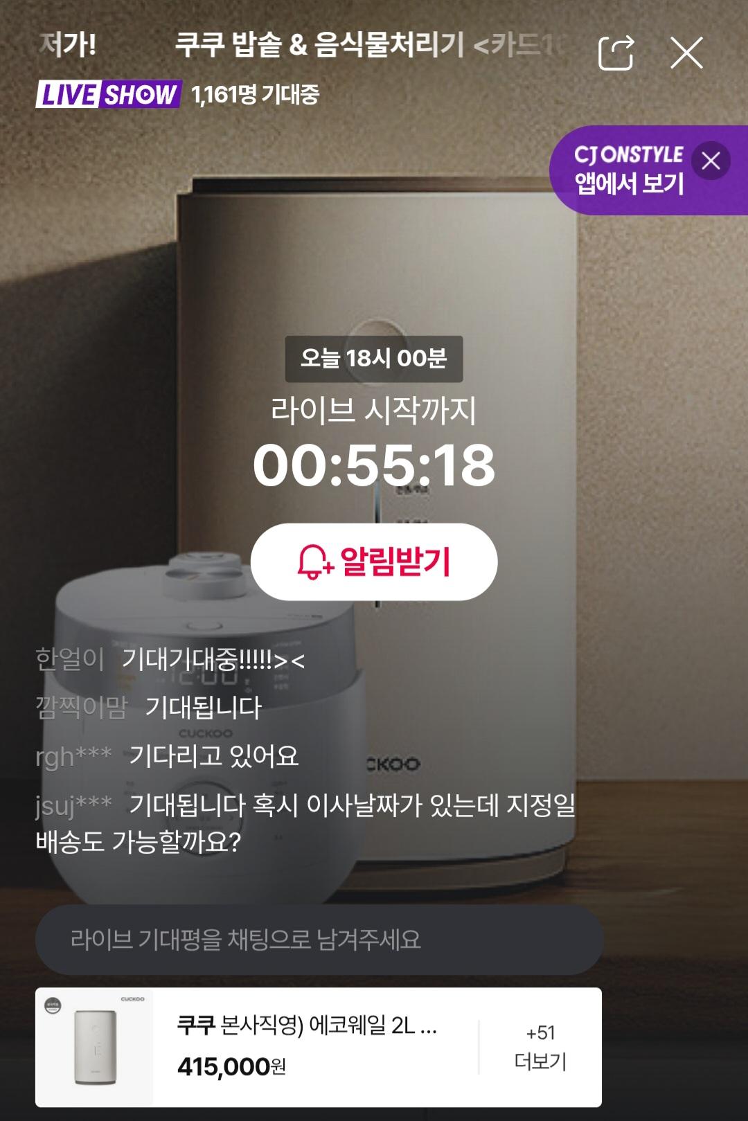 CJ온스타일에서 쿠쿠 밥솥 라이브 합니다