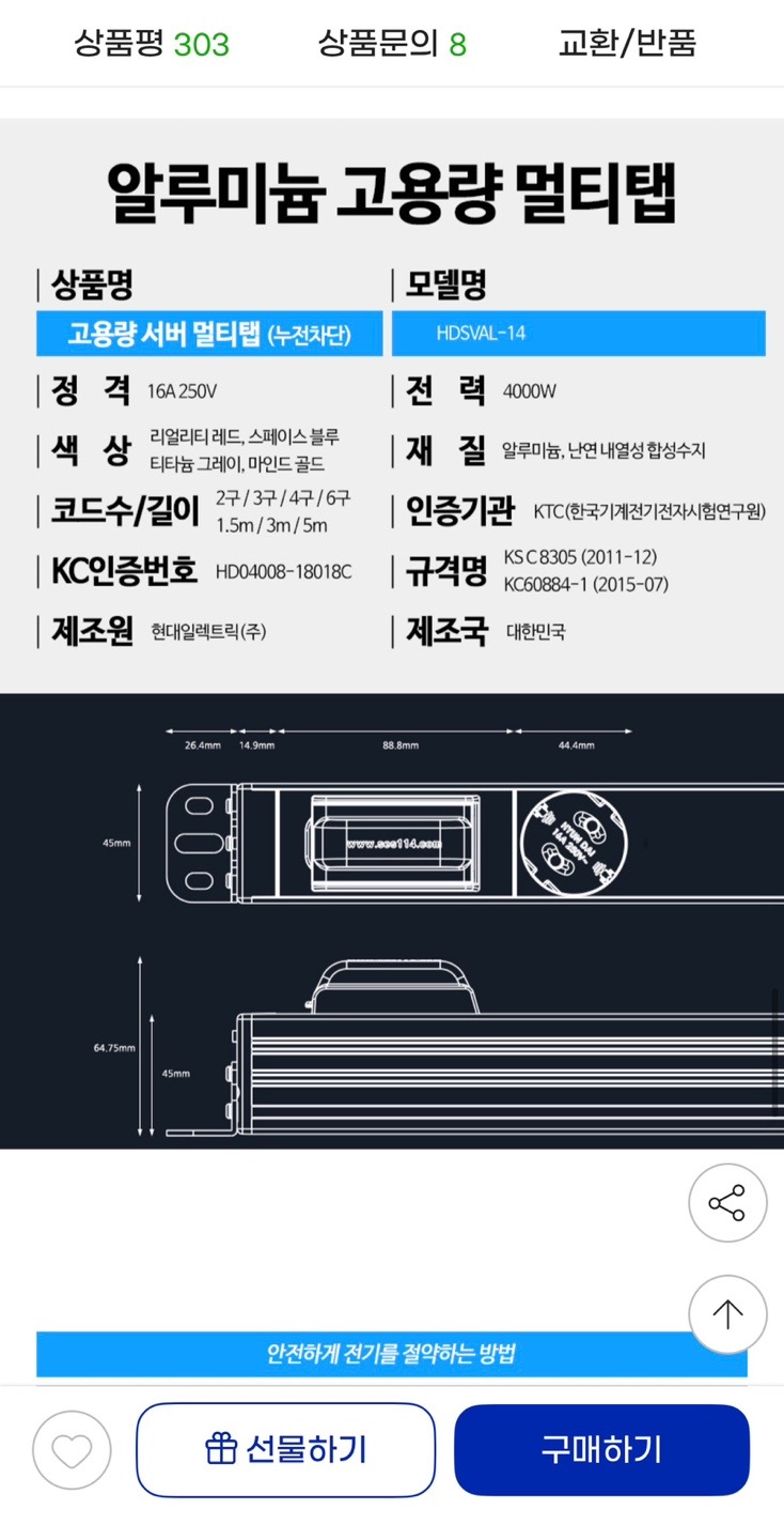 4000W 고용량에 전선 두꺼워서 발열 걱정 없구요