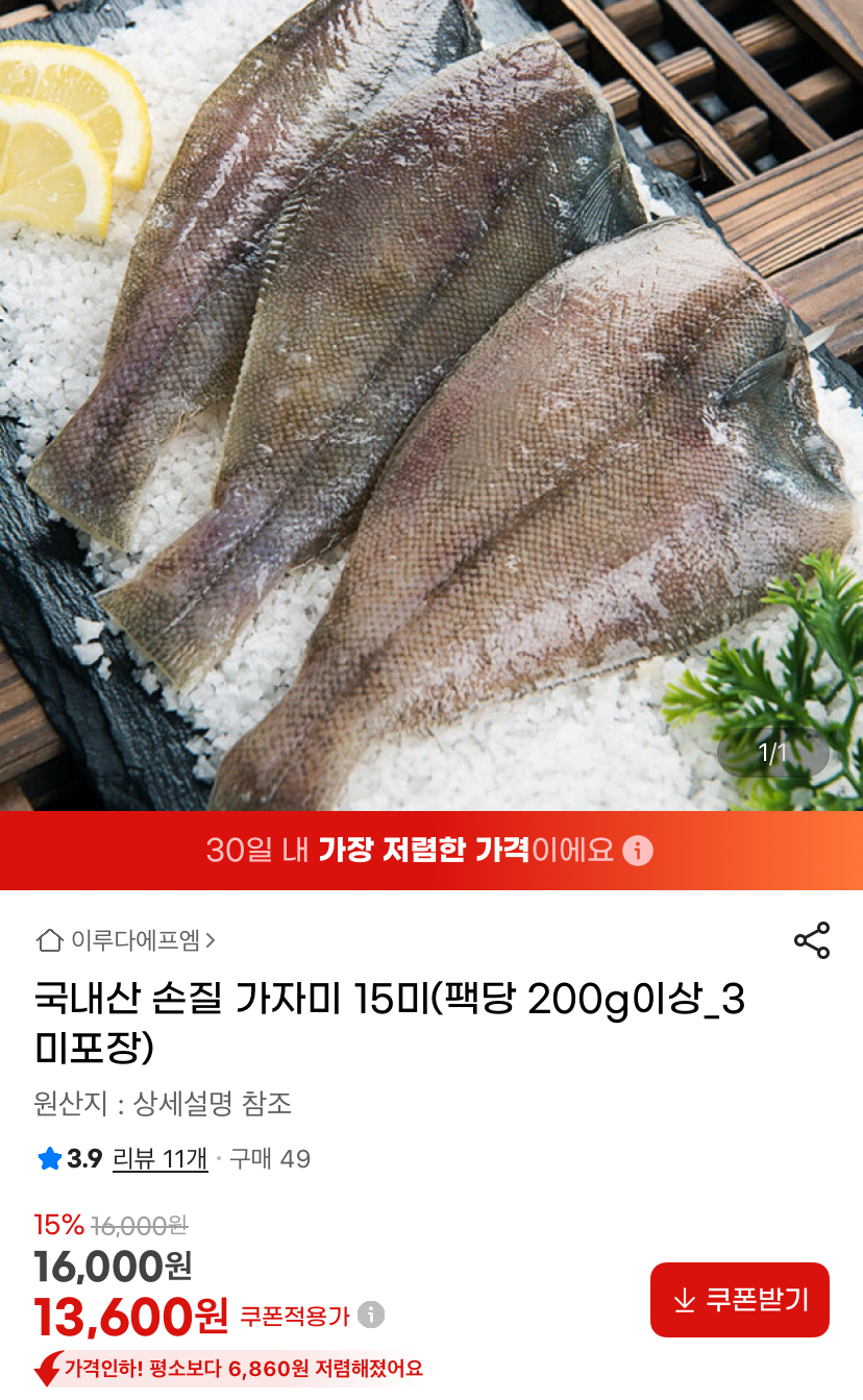 국내산 가자미 15마리 구성입니다. 한 팩에 3미씩, 한 마리 200g 이상이라 크기 괜찮네요