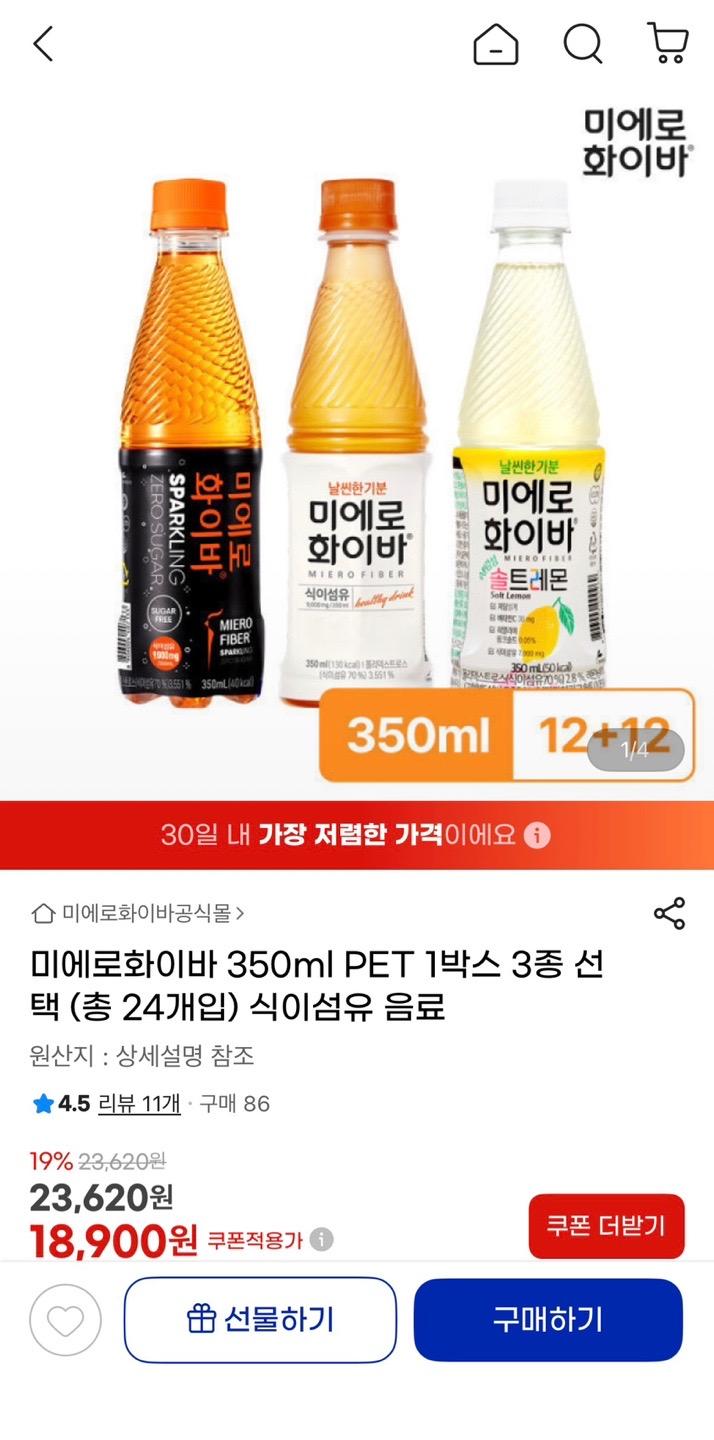[지마켓] 미에로화이바 350ml PET 12입+12입 골라담기 (18,900원/무배) > 국내핫딜