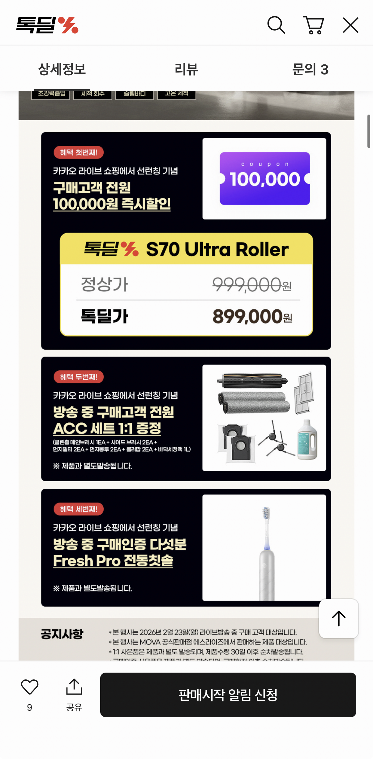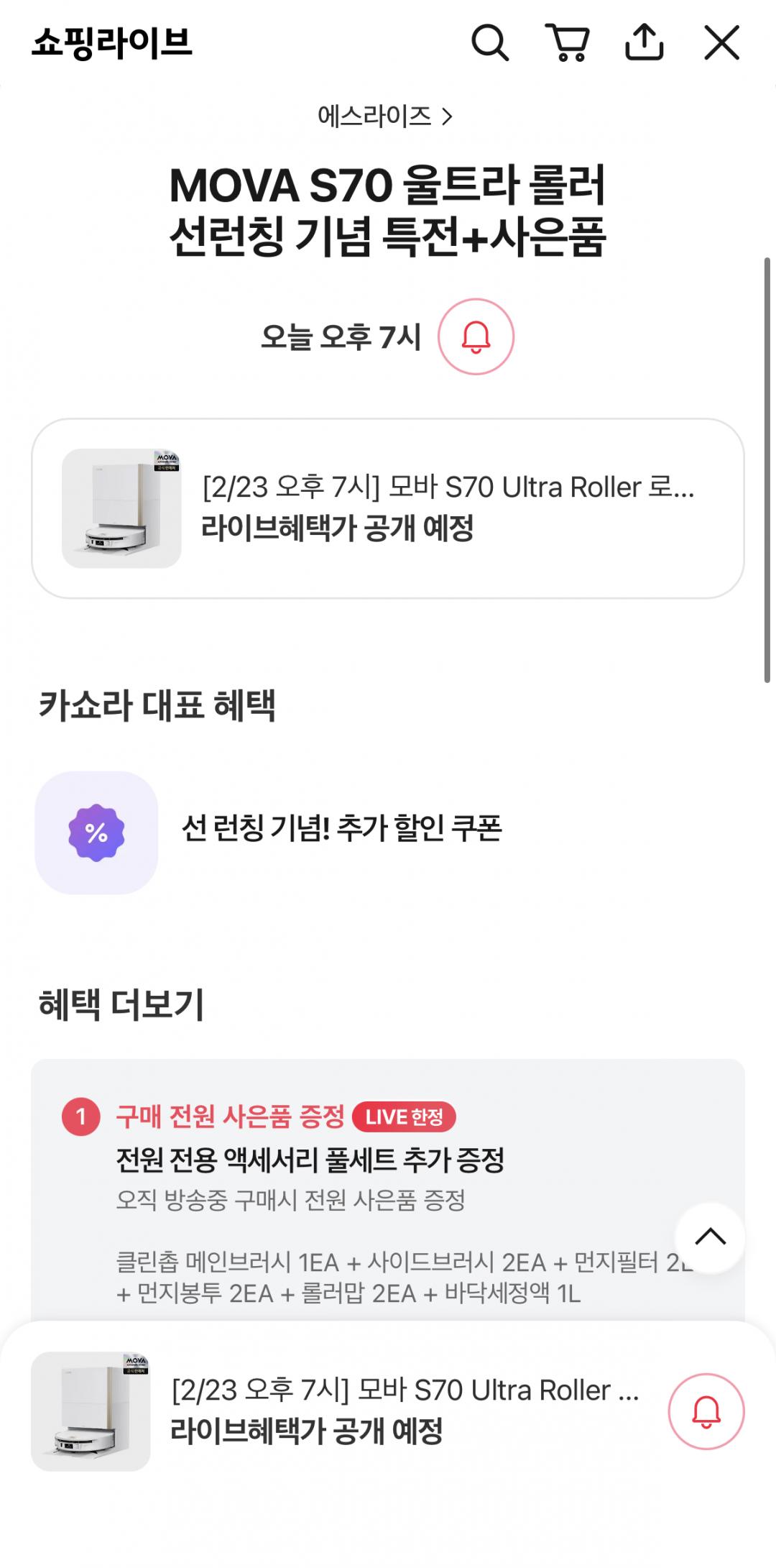 [카카오라이브] 모바 S70 울트라 롤러 로봇청소기 (899,000원/무료)