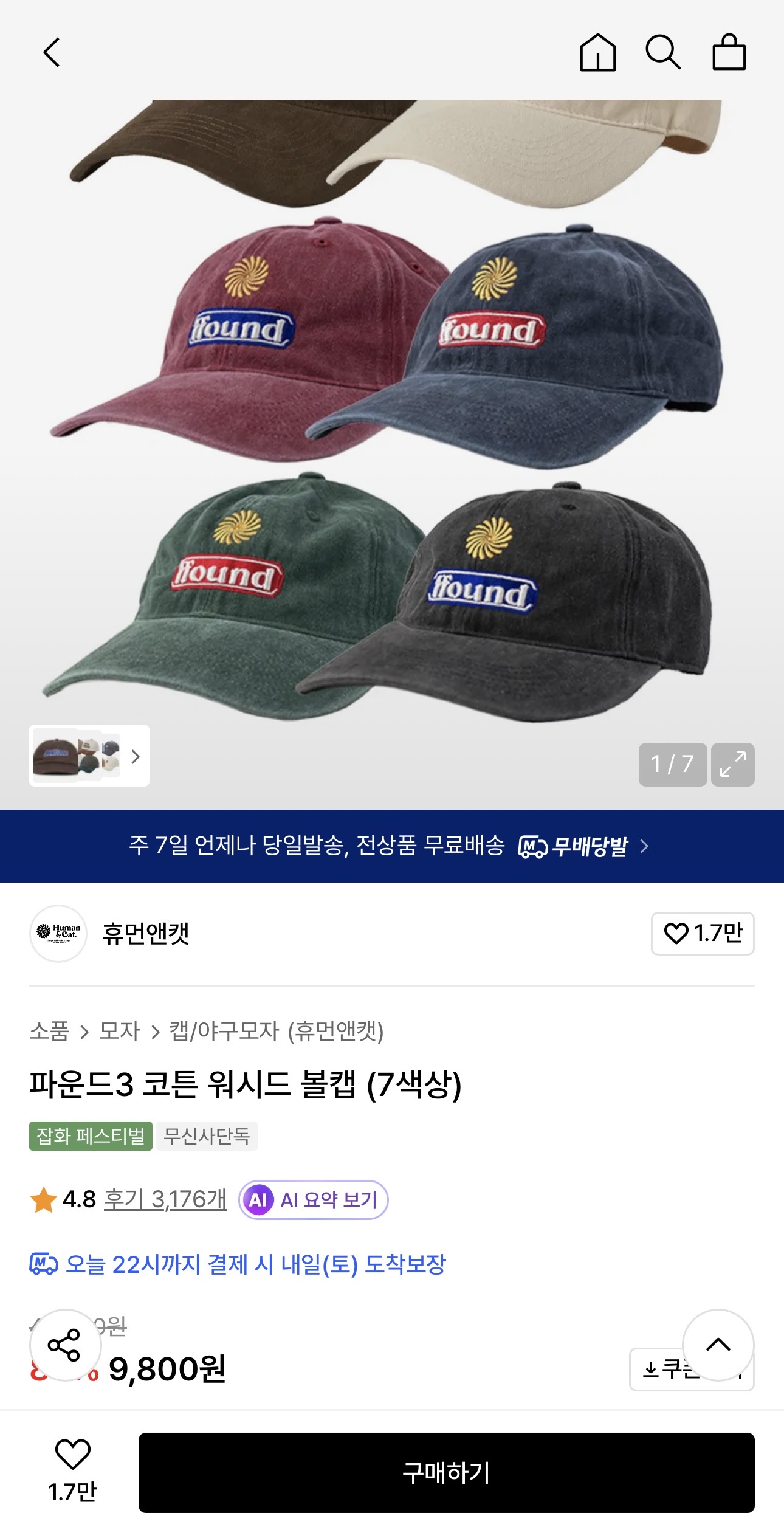 [무신사] 휴먼앤캣 파운드3 코튼 워시드 볼캡 7색상 (9,800원/무료) > 국내핫딜