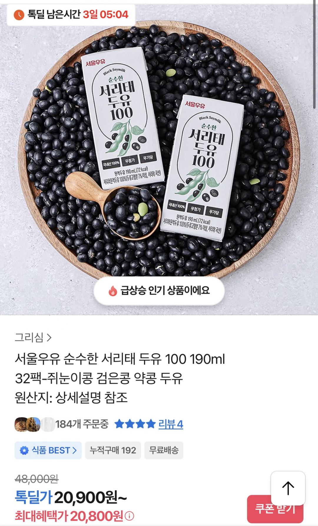 [카카오]서울우유 순수한 서리태 두유 100 190ml 32팩(20,800원/무료) > 국내핫딜