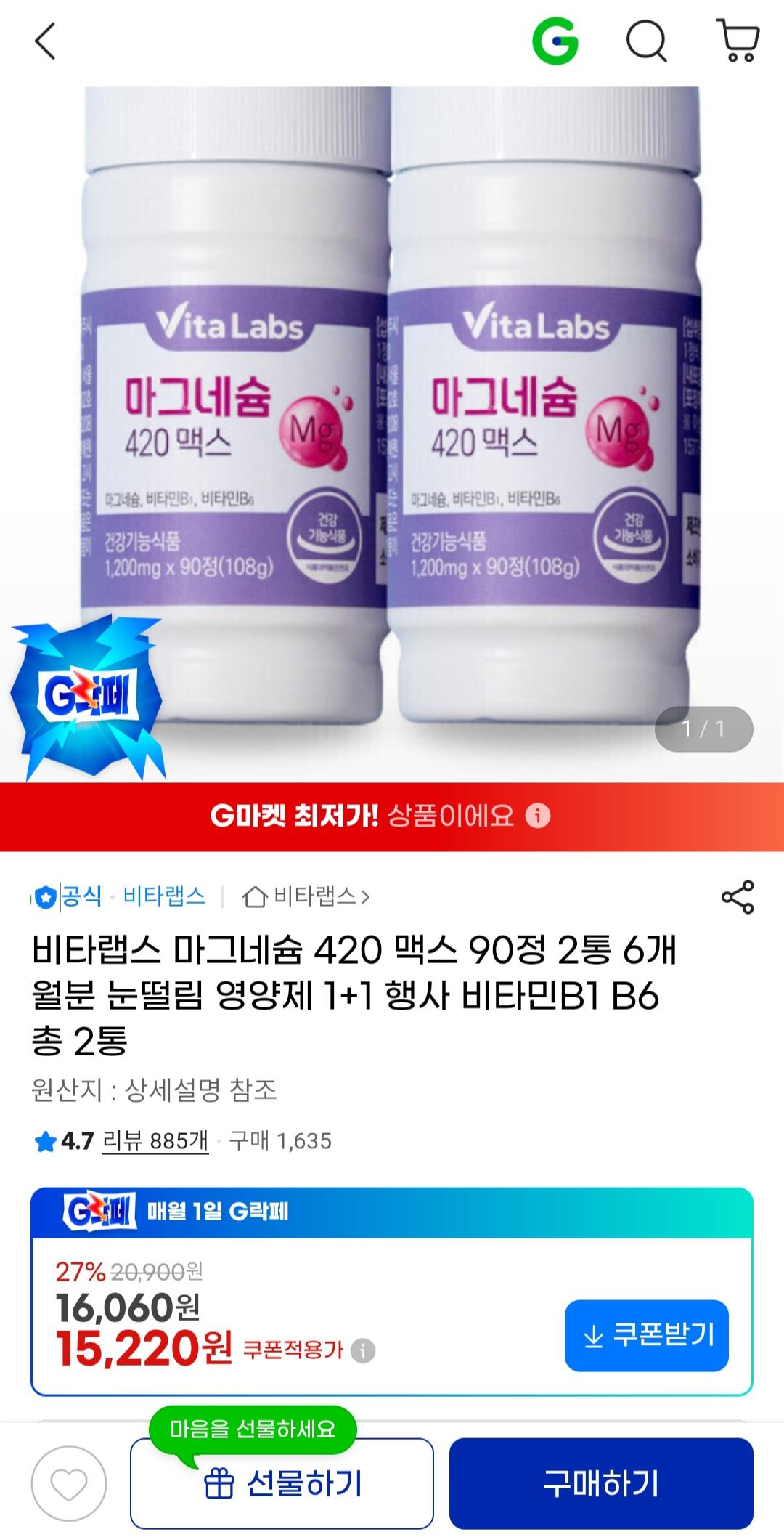 [지마켓] 비타랩스 마그네슘 420 맥스 90정 2통 6개월분 1+1 (15,220원 / 무료배송) > 국내핫딜