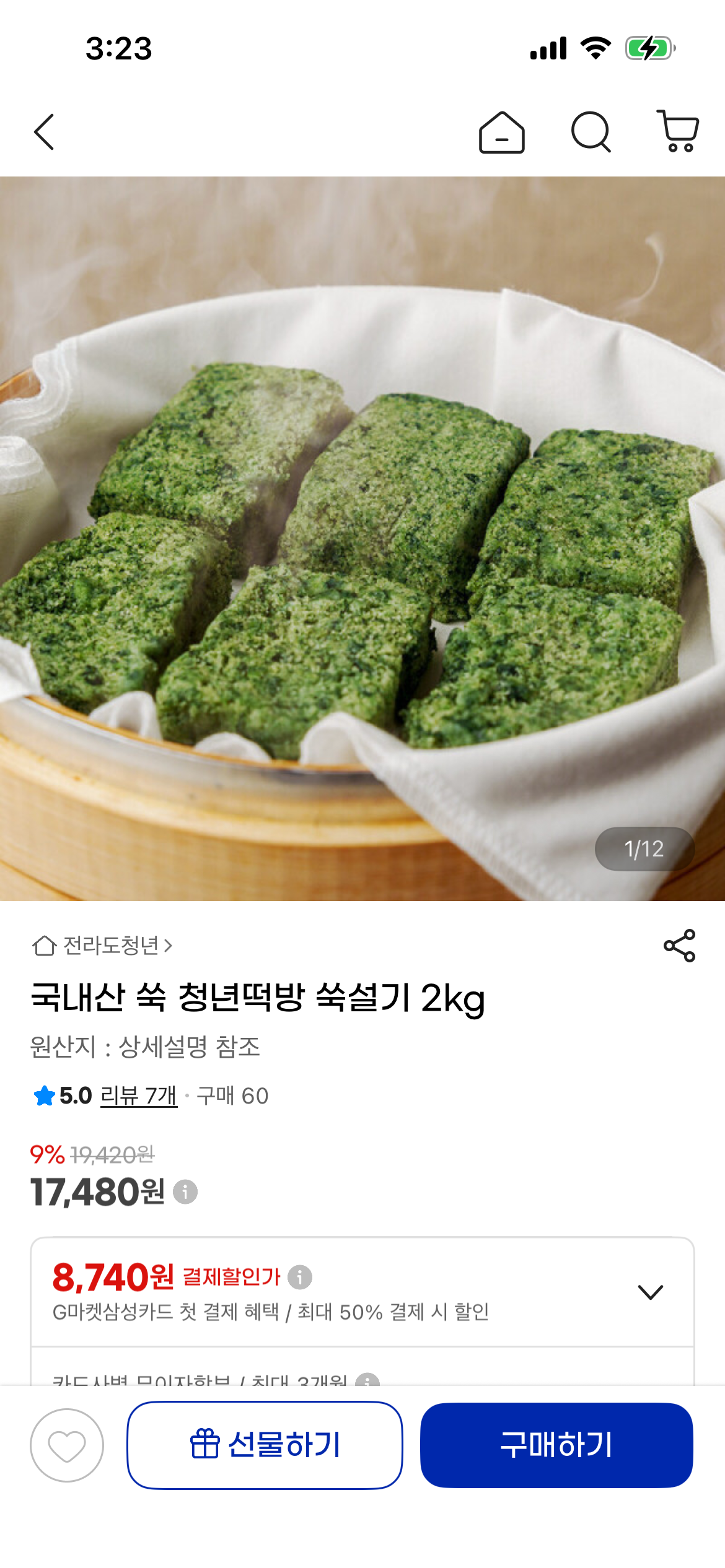 [지마켓] 국내산 쑥 청년떡방 쑥설기 2kg (17,480원/무료)