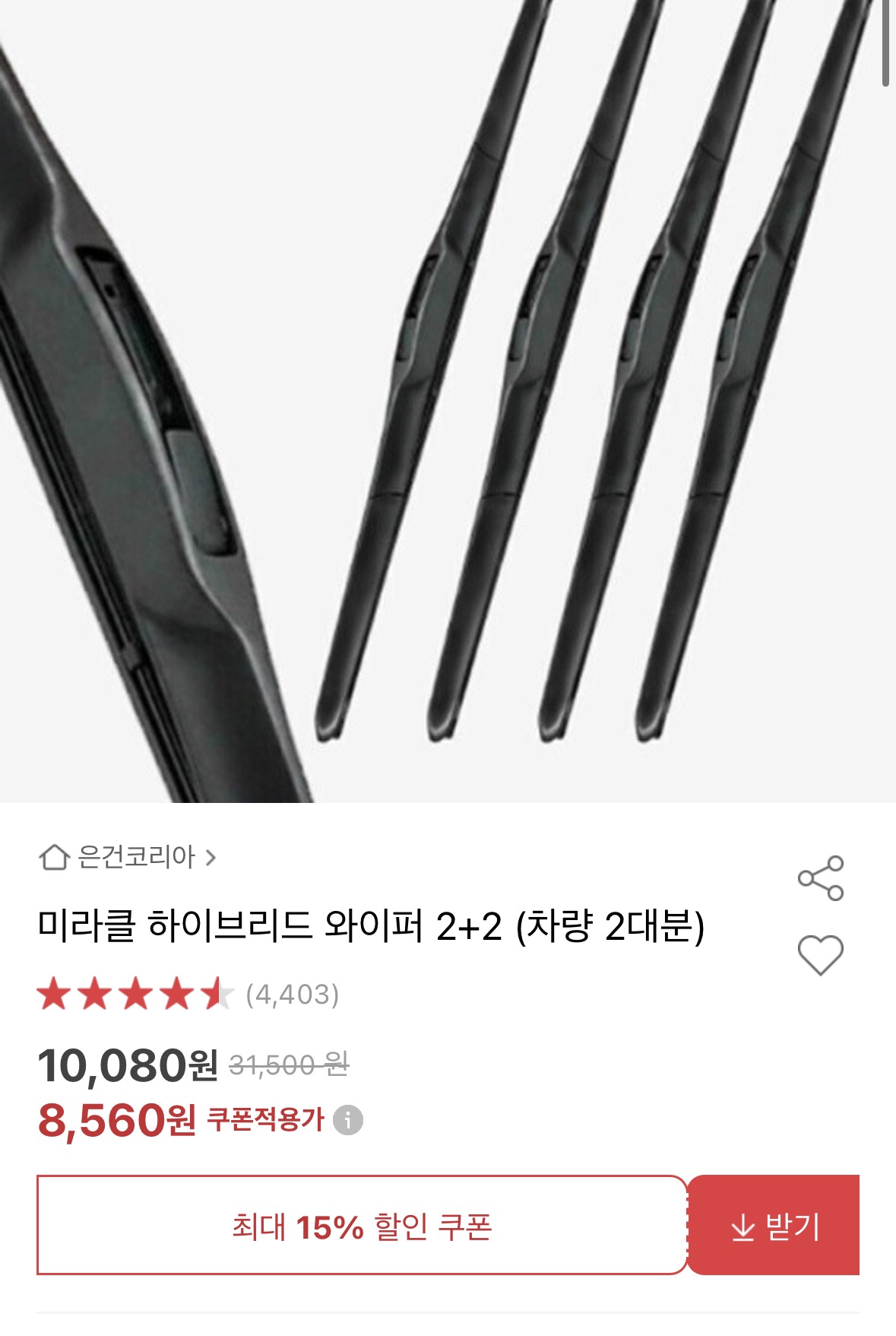 [옥션]미라클 하이브리드 와이퍼 2+2 차량 2대분 (8,560원/ 무료)
