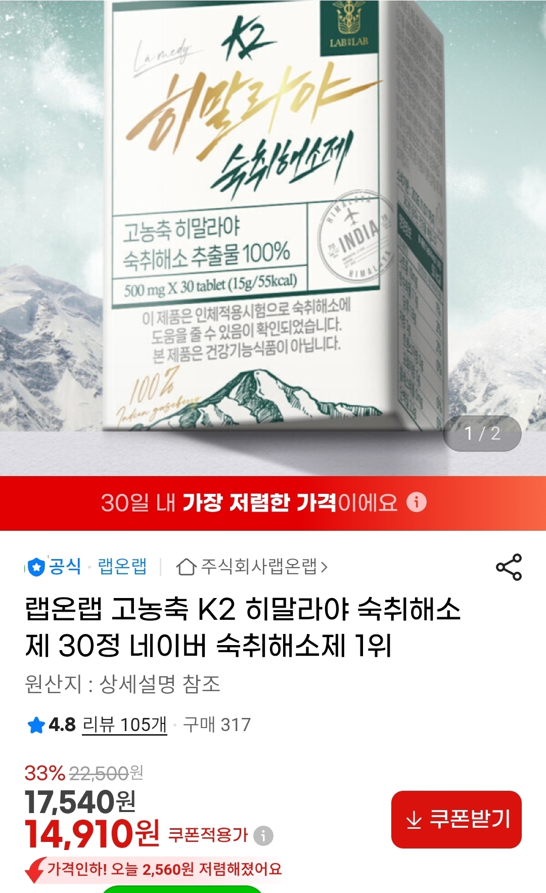 [지마켓]랩온랩 고농축 K2 히말라야 숙취해소제 30정(14,910원/무배) > 국내핫딜