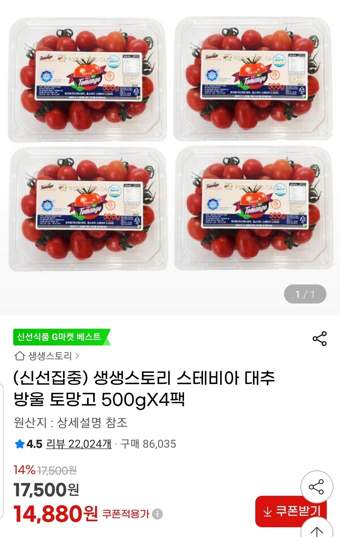 [지마켓] 스테비아 대추 방울 토망고 500gX4팩 (14,880원/무배) > 국내핫딜