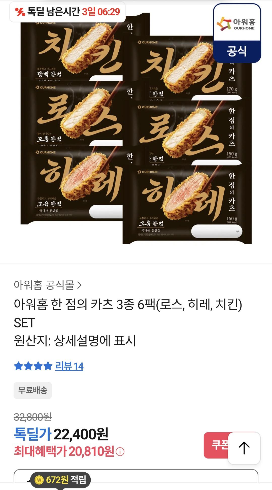 [톡딜]아워홈 한 점의 카츠 3종 6팩(로스, 히레, 치킨) 세트(20,810원/무배) > 국내핫딜