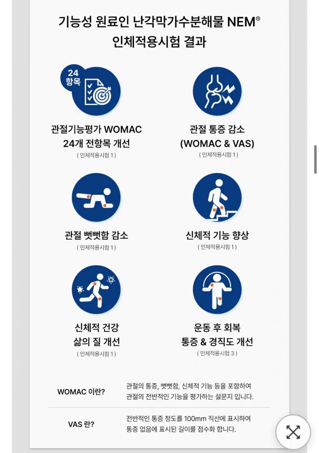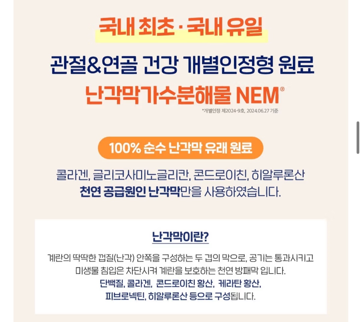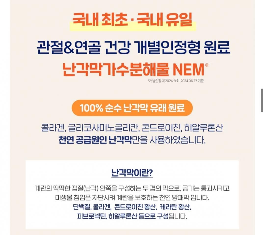 관절 연골건강 특허원료로 만든 난각막이고 콜라겐, 콘드로이친, 히알루론산 성분도 빵빵해요.