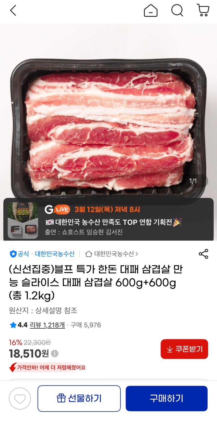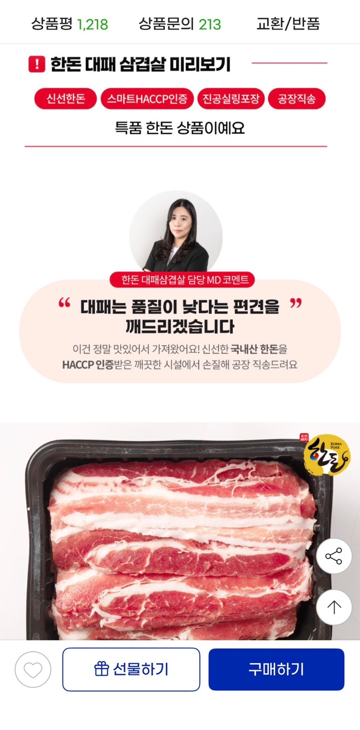 [지마켓] 한돈 대패 슬라이스 삼겹살 1.2kg (18,510원/무배) > 국내핫딜