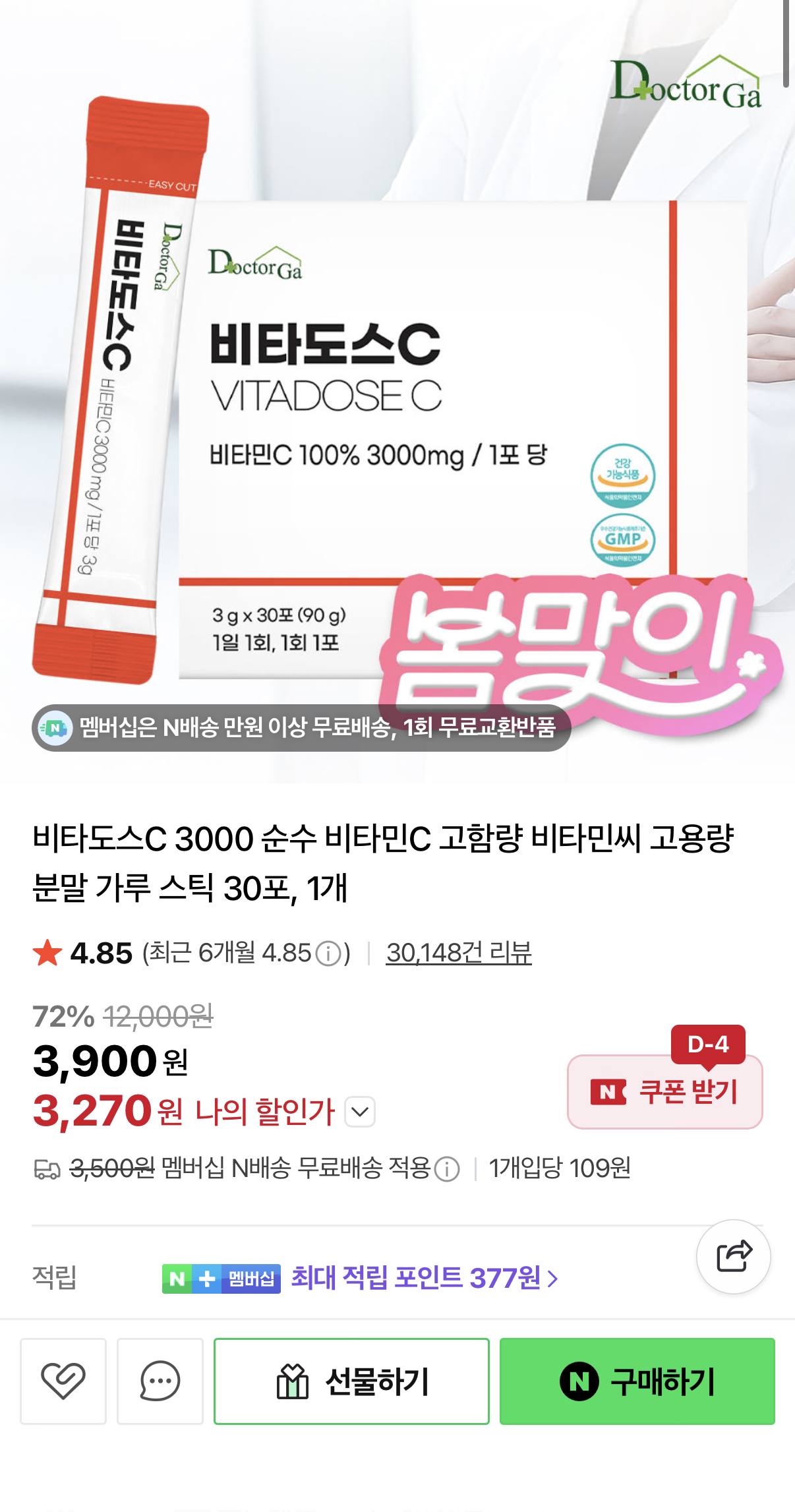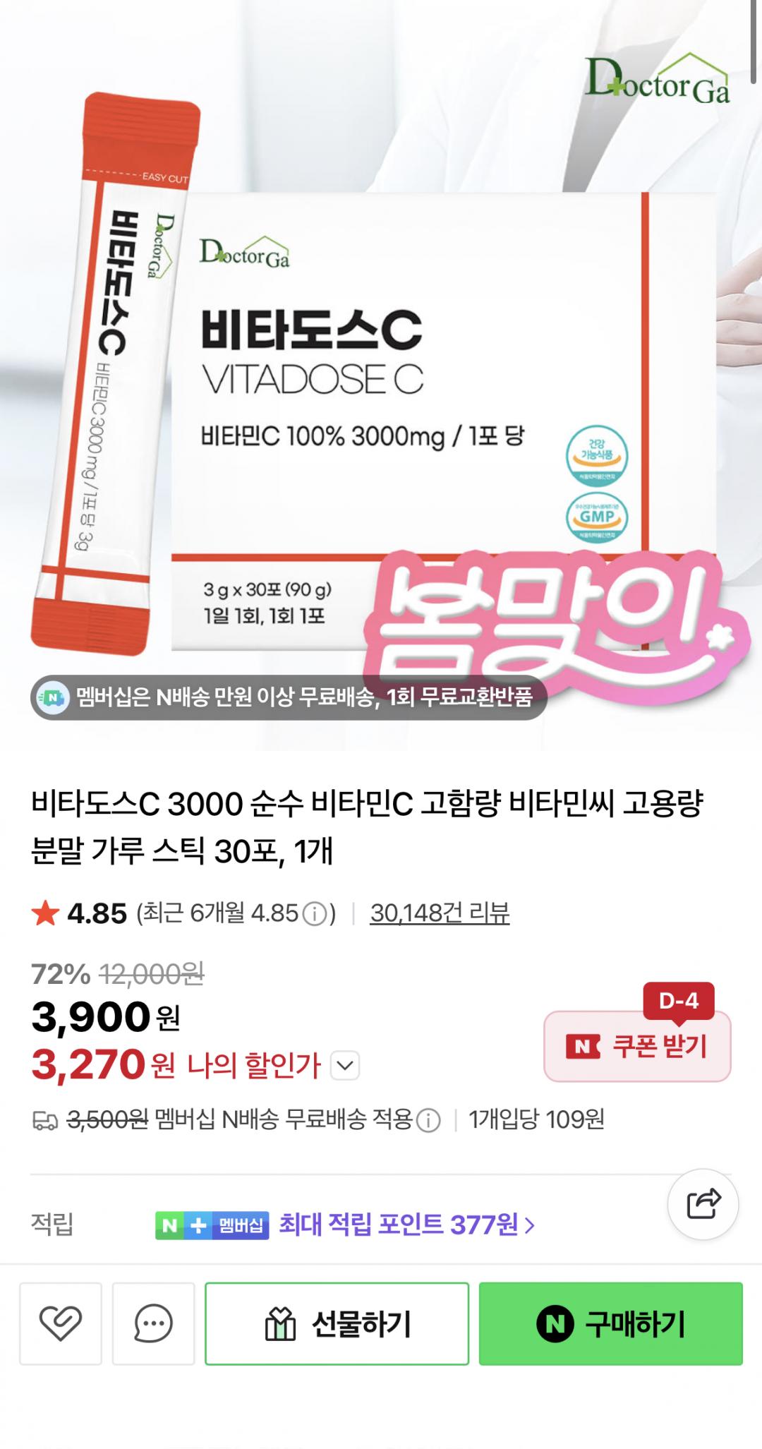 [네이버] 비타도스C 3000 순수 비타민C 30포 (3,270원/네멤무배)