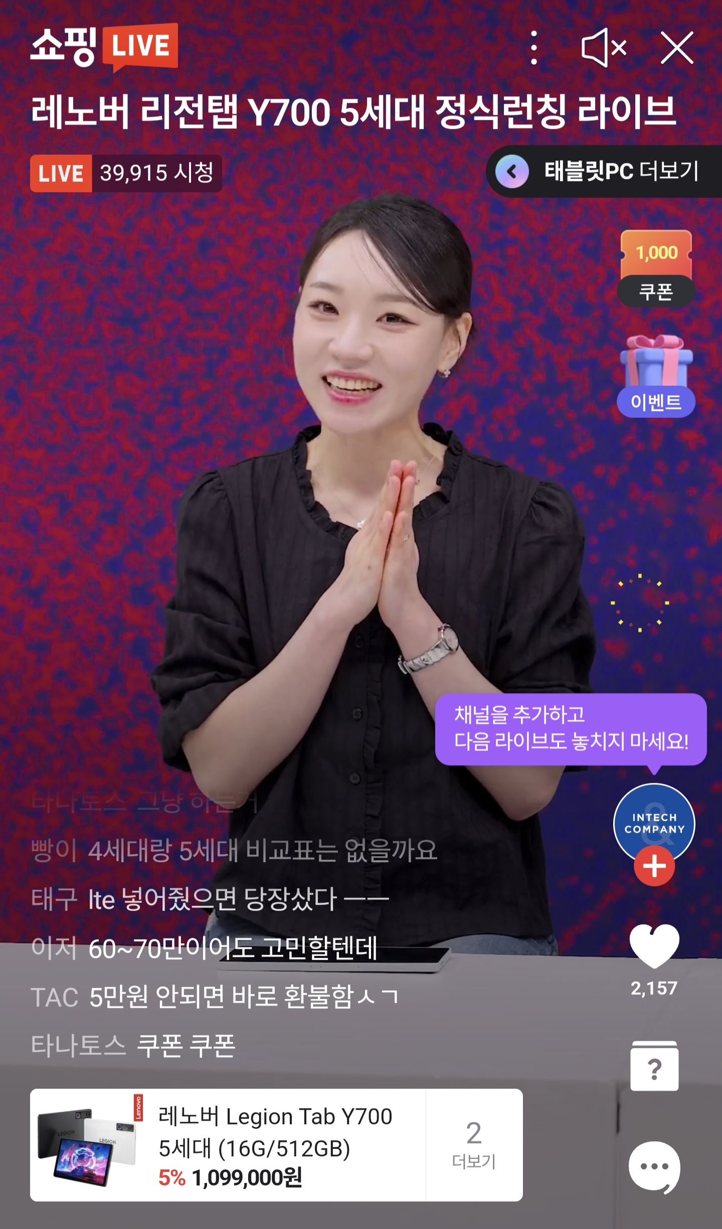 [네이버] 레노버 리전탭 Y700 5세대 12G 256GB (943,020원 /무료)