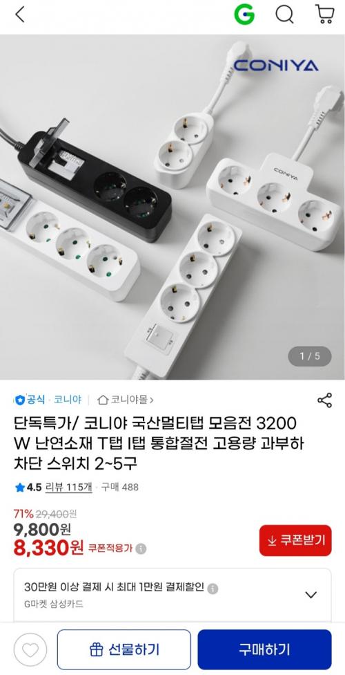 [지마켓] 코니야 국산멀티탭 모음전 2~5구 (8,330원 / 무료배송) > 국내핫딜