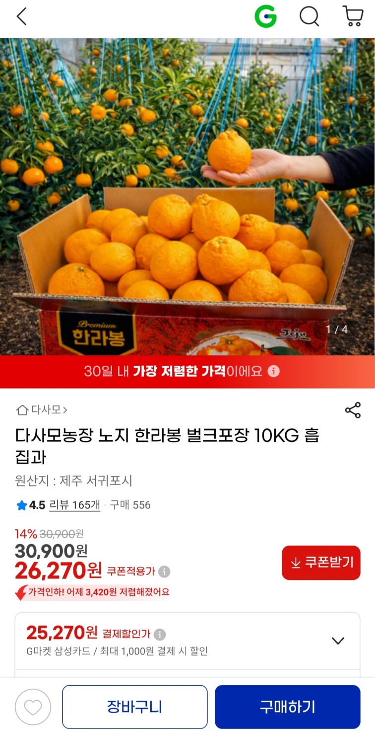[지마켓] 노지 한라봉 벌크포장 10KG 흡집과 (26,270원 / 무료배송) > 국내핫딜