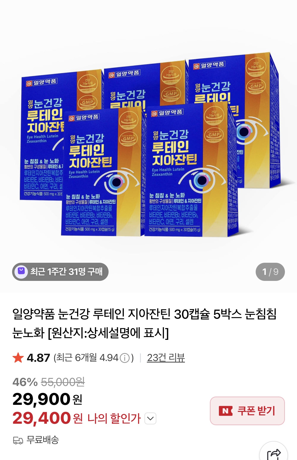[네이버] 일양약품 눈건강 루테인 지아잔틴 30캡슐 5박스 (29,400원/무료)
